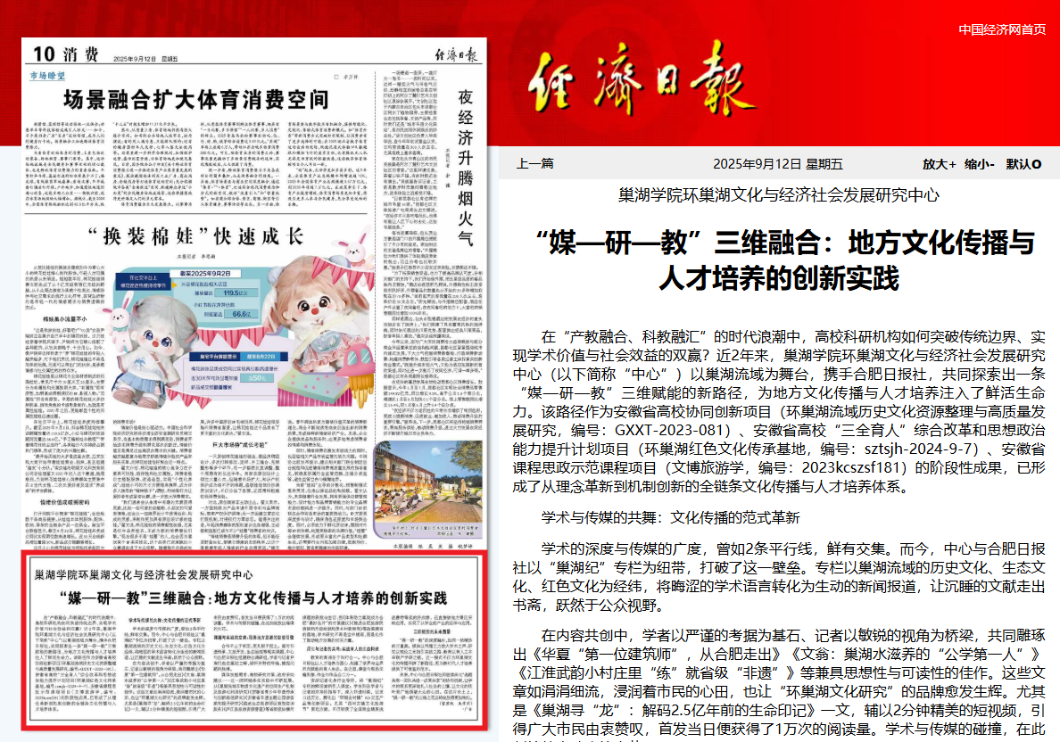9月12日,《经济日报》以《必赢626net入口环巢湖文化与经济社会发展研究中心:“媒-研-教”三维融合:地方文化传播与人才培养的创新实践》报道了必赢626net入口环巢湖文化与经济社会发展研究中心与合肥日报社集团共谋、共创、共享地方文化传播与人才培养的做法和成效。