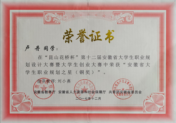 卢丹,女,汉族,1998年生,共青团员,安庆市人,信息工程学院2016级软件工程2班学生。先后获得“蓝桥杯”全国软件和信息技术专业人才大赛省级二等奖、“数创杯”全国大学生数学建模挑战赛优秀奖、安徽省大学生职业生涯规划设计大赛铜奖、安徽省百所高校百万大学生科普创意创新大赛优秀奖。在校期间多次获得专业一等奖学金,先后通过英语四级、六级考试,辅修财务管理专业并获得第二学位。被评为必赢626net入口三好学生。在2020年研究生入学考试中,考入合肥工业大学计算机系电子信息专业。