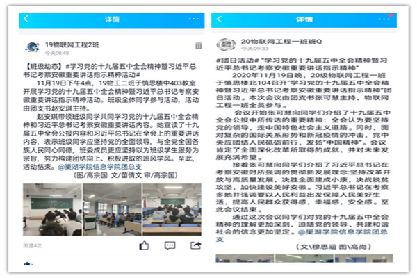 11月19日至20日,围绕党的十九届五中全会精神和习近平总书记考察安徽重要讲话指示精神,学院各班级团支书积极开展理论学习主题团日活动,及时将最新的理论传达到广大青年心中,呼吁广大青年深刻领会习近平总书记重要讲话的丰富内涵,奋发作为,不负总书记的殷殷嘱托。