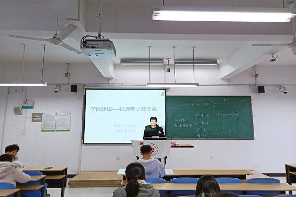 为做好新生的职业规划教育指导,营造良好的育人环境与学习氛围, 12月11日上午10:00,信息工程学院于慎思楼北201教室举行学风建设——优秀学子经验分享会。国家奖学金获得者——郭创业,校级一等奖学金获得者——郑子龙、郑国风,校优秀团学干部——徐莹,分别作了分享汇报。本次分享会由院辅导员陈文静主持,2020级各班级学生代表参加。