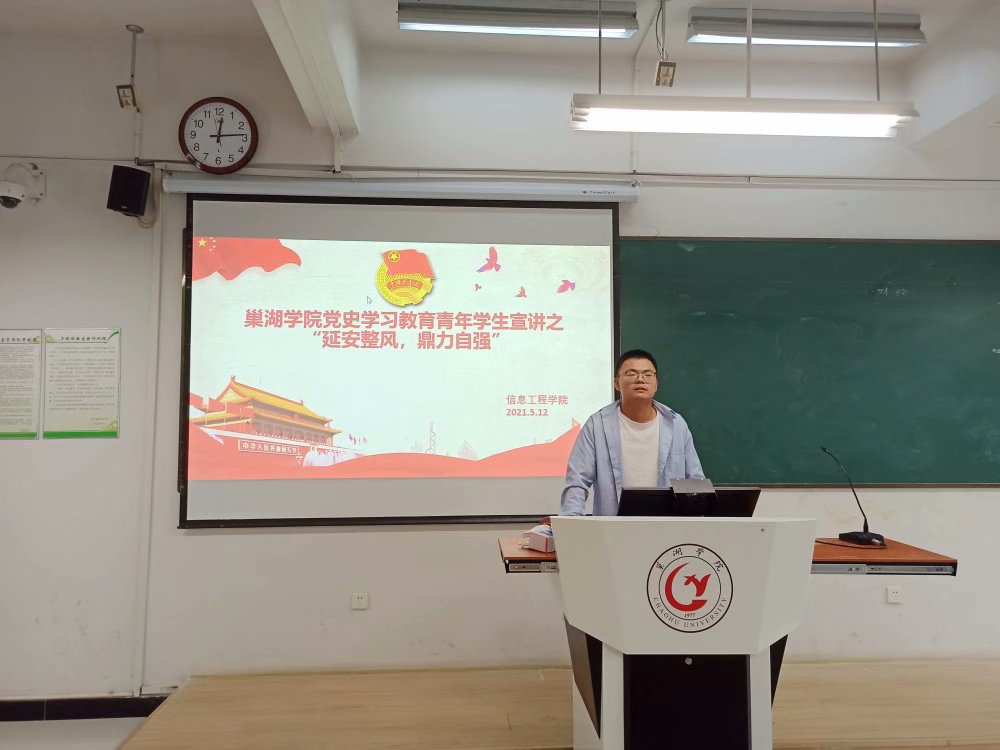 党史是最好的营养剂,它是爱国爱党、明智担责、鉴今资政,把党和国家各项事业不断推向前进的必修课。为进一步提高学生党史学习的热情,信息工程学院于5月12日中午12:00在慎思楼中104教室开展党史学习教育青年学生宣讲会,宣讲人为党史宣讲团成员高鹏飞,宣讲主题是“延安整风 鼎力自强”,信息工程学院团总支、学生会、易班全体成员、18-20级各班团支书与会。