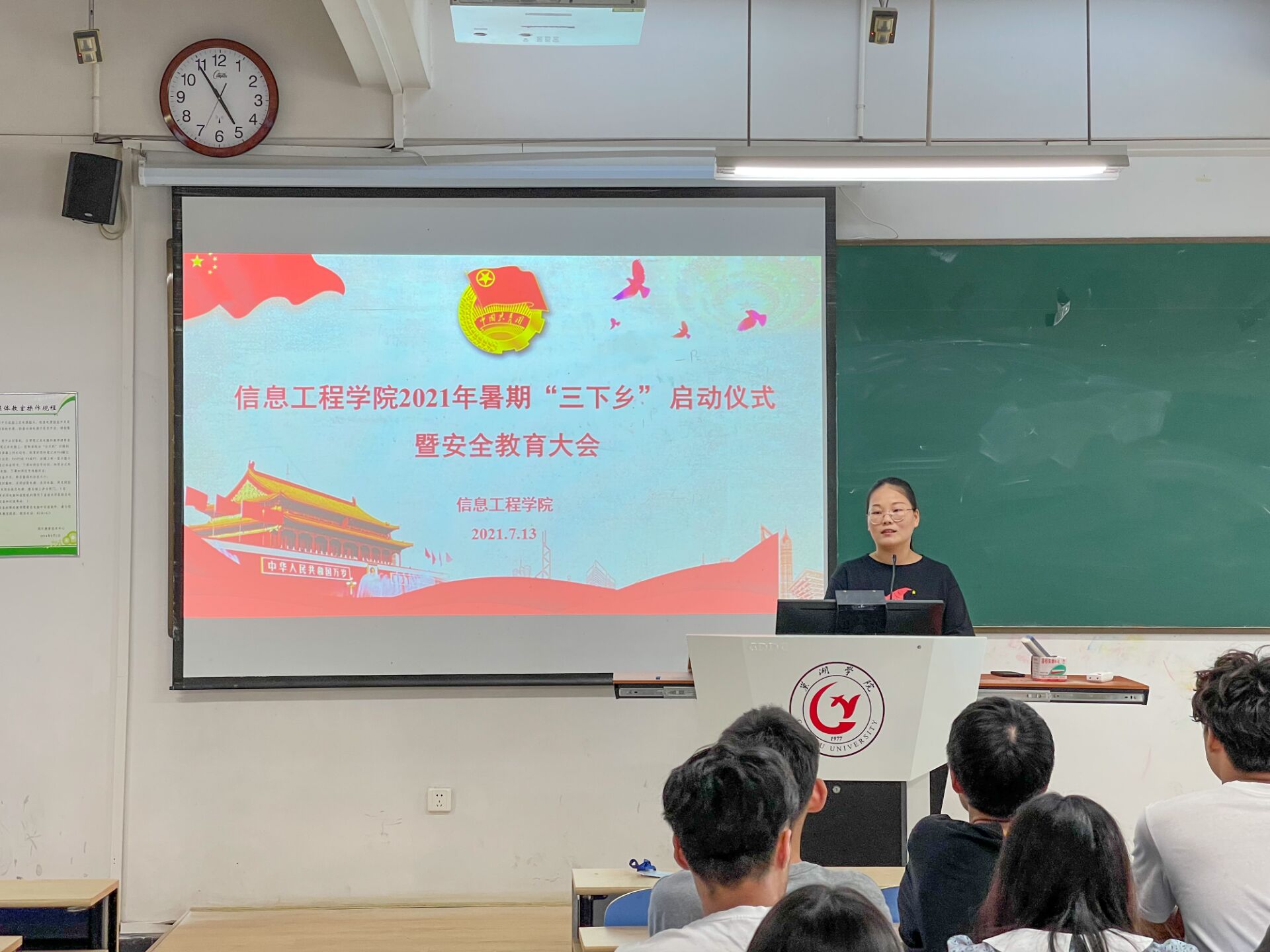 7月12日下午13:00,信息工程学院举行2021年大学生志愿者暑期“三下乡社会实践活动启动仪式暨安全培训会。信息工程学院团总支书记刘小燕和团总支副书记何平出席会议,并宣布2021暑期“三下乡 活动正式开始。本次会议由刘小燕主持,信息工程学院辅导员、社会实践活动指导老师与信息工程学院暑期三下乡服务队各团体成员参会。