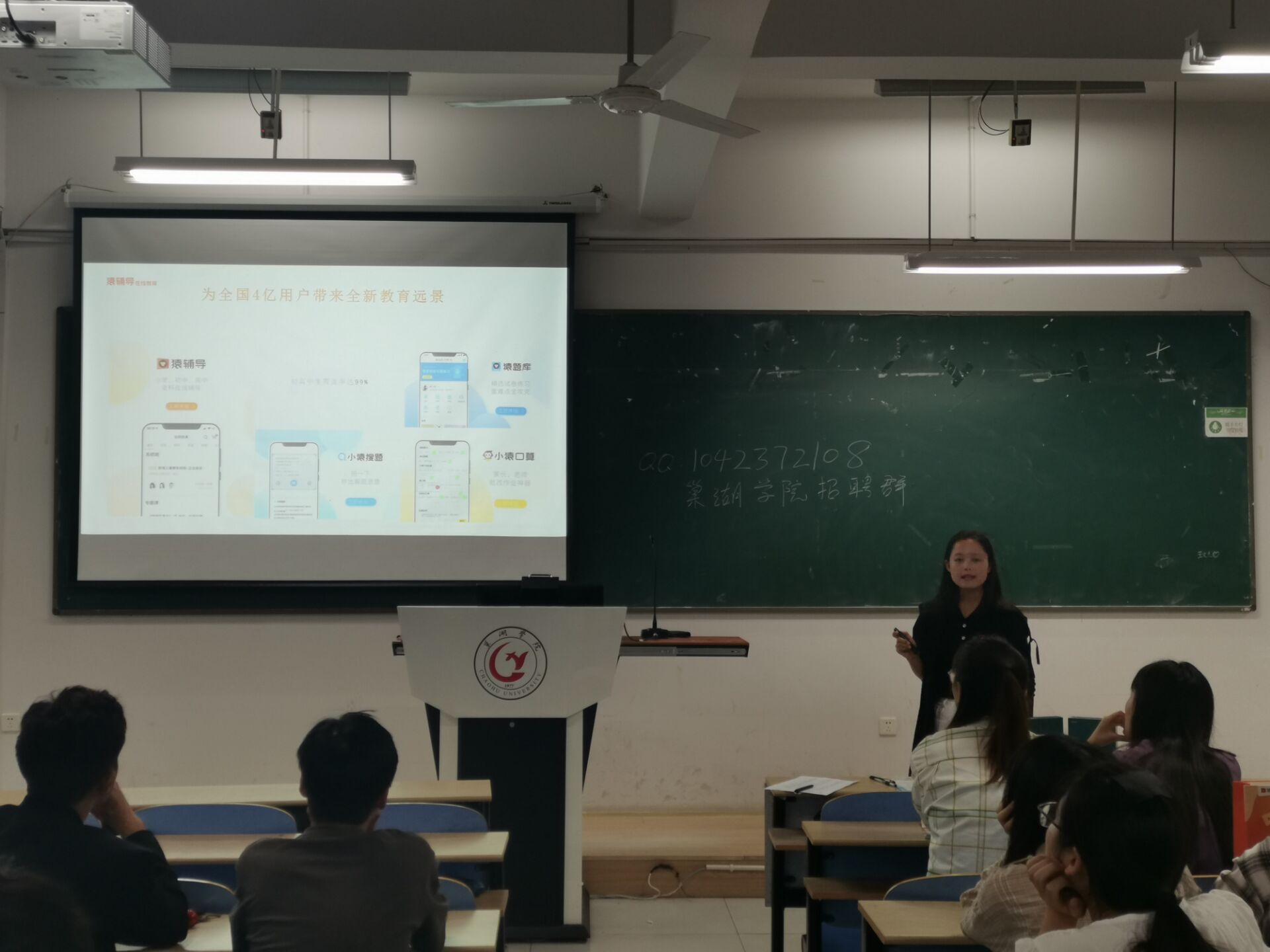 10月9日下午,猿辅导公司于慎思楼中301开展招聘会,本次招聘会有猿辅导分公司人力资源负责人邢萍萍主讲,21届部分毕业生参加。