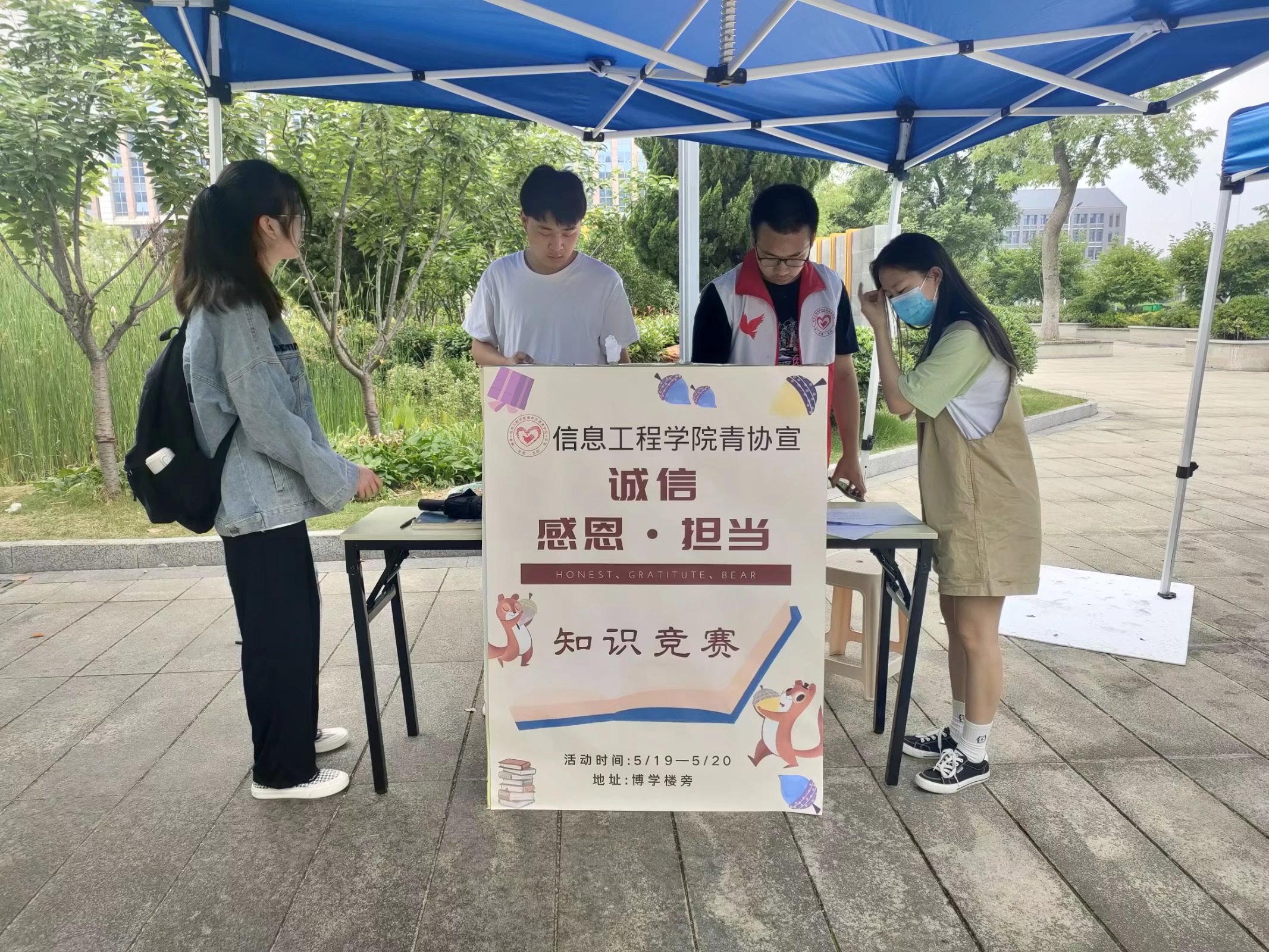 活动开展前,信息工程学院青协组织开展会议,讲述活动总流程并向负责活动的工作人员提出活动注意事项。活动进行期间,同学们踊跃报名,志愿者们耐心解答问题。子活动一知识竞赛,参赛人员到达指定教室遵守秩序、认真答题,比赛前八名的同学将进入复赛,同时子活动二中工作人员们收到众多优秀的活动作品,在这些作品中展现了当代大学生的青春风采。活动开展后,工作人员筛选出优秀作品并公布复赛参赛者名单。至此,本次“诚信、感恩、担当”主题教育活动圆满结束。
