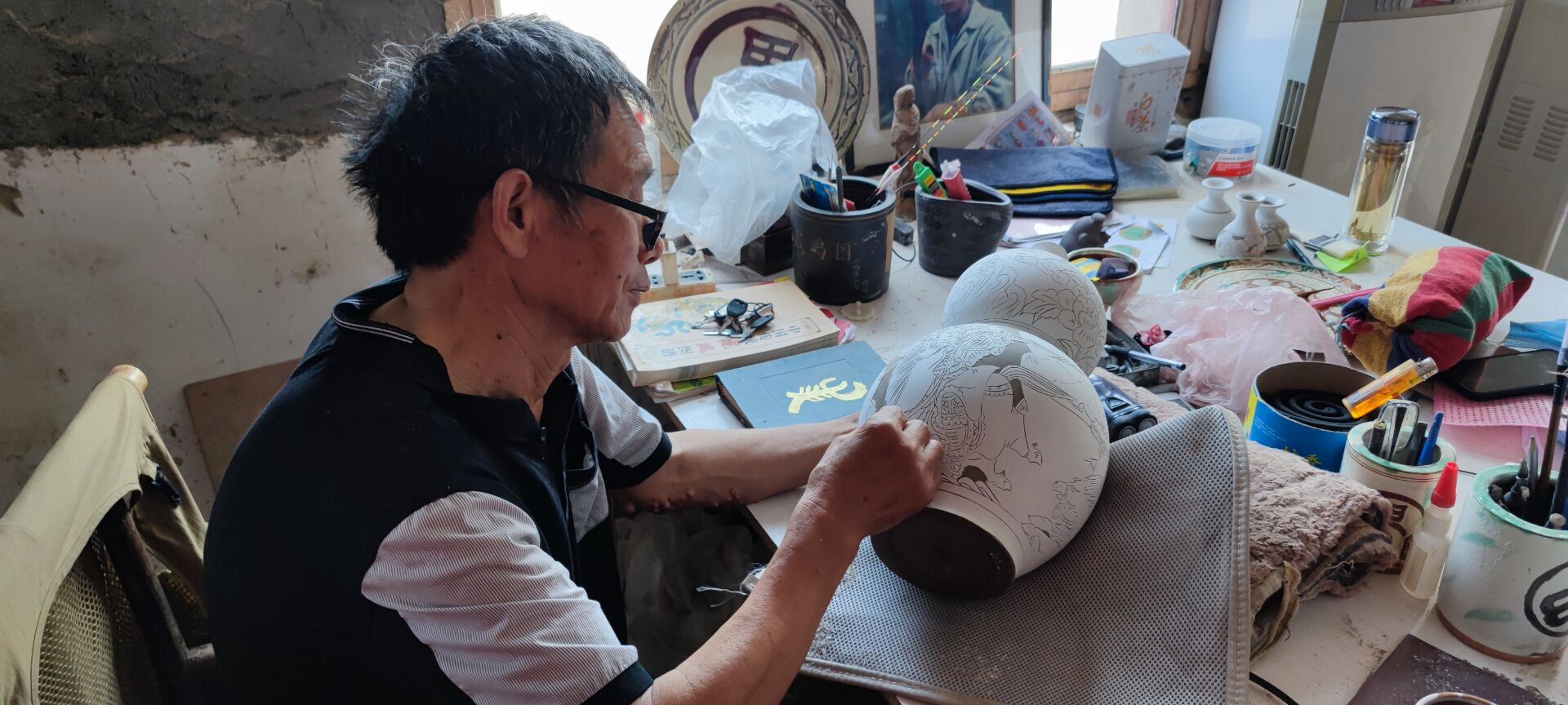 随后团队成员前往陶艺公园,拜访了界首彩陶传承家族之一的卢氏卢群海大师。此时卢先生正细心的对彩陶进行刻花工作。