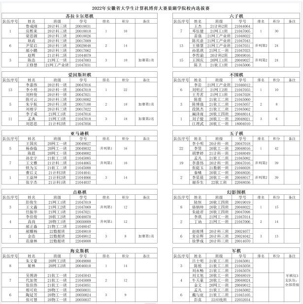 经过激烈的角逐和裁判小组公平公正的评判,最终确定每个棋种前三名队伍代表学院参加2022年安徽省大学生计算机博弈大赛。
