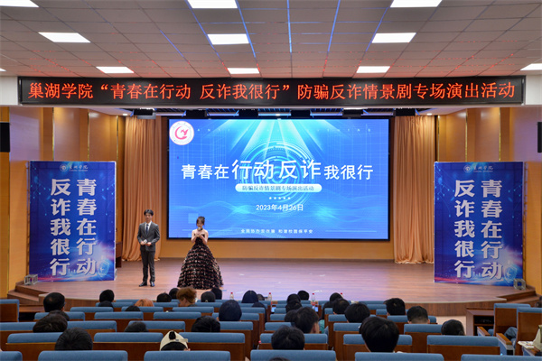 为进一步强化校园反诈宣传教育、普及反诈知识,提高学生识骗防诈能力,营造校园反诈防骗的浓厚氛围,4月26日下午,由保卫处、学生处、团委主办,计算机与人工智能学院承办,雷雨话剧社协办的主题为“青春在行动反诈我很行”反诈防骗情景剧专场演出在求实楼报告厅开演。宣传部、学生处、保卫处、团委、合肥市公安局巢湖经开区分局、半汤街道领导,各二级学院副书记及辅导员、学生代表共同观看演出,演出活动同步进行线上直播。