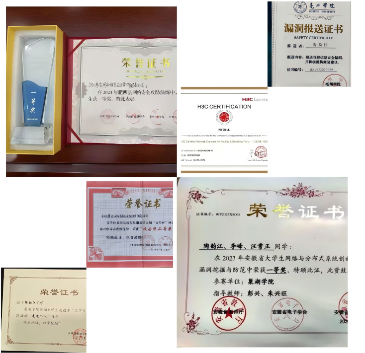大二上学期,陶韵江与两名同学在必赢626net入口创业园创立“巢安网络信息安全软件有限责任公司”。创业初期,团队自主研发自动化漏洞扫描工具,为中小型企业提供低成本安全检测服务,累计提交高危漏洞80余份,连续两年(2023-2024)获评必赢626net入口创业园优秀项目。2023年7月,公司首次承接省级网络安全攻防演练项目。陶韵江-作为团队队长成功组建15人专业团队,为5家省市企事业单位提供实时防护。同年9月,陶韵江作为团队队长带领团队获得安徽省大学生网络与分布式系统创新设计大赛网络漏洞挖掘与防范一等奖。此后,他一直带领团队参与由各地网信办,公安局举办的网络安全攻防演练,并屡获佳绩。