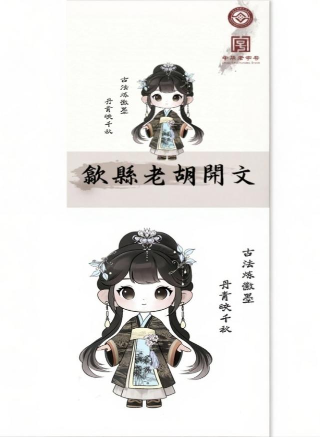 另一组IP形象以徽墨为灵感,在徽墨厂原有包装上进行二次设计。以沉静墨色为基底,巧妙融入灵动亮色点缀,赋予小女孩形象鲜活生命力。服饰纹样萃取徽墨山水画精髓,层叠晕染的山石云水与劲节分明的竹影交织,既显传统笔墨意趣,又添自然清新之气。发间点缀玉簪、流苏等古风发饰,随动作轻摇,与墨色衣衫相映成趣。整体造型在坚守徽墨文化底蕴的同时,以活泼配色与灵动细节打破沉闷,让古典韵味与少女灵动感达成巧妙平衡,传递出雅致又不失朝气的独特气质。