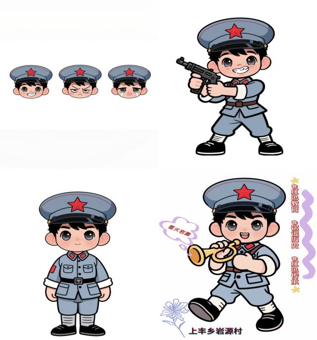 其一以红军为灵感,主体采用灰蓝色军装,军装线条利落挺括,搭配领口红星徽章与腰间武装带,强化红军身份辨识度。形象身姿挺拔如松,头部微扬,眼神锐利明亮,嘴角带刚毅笑意,既显坚定信念,又透着蓬勃朝气。设计在还原历史元素的同时,巧妙运用圆润线条弱化生硬感,让革命精神的厚重与年轻化表达自然融合。同时,还设计了开心、愤怒等多款生动表情包,后续将添加入微信表情包库进行传播,也可以应用于胸扣、热缩挂件、玩偶等文创产品设计,让红色文化以更活泼的方式走进大众生活。