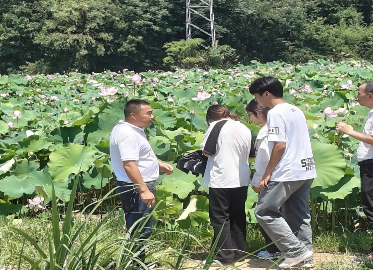 之后实践团走入了池州市牛头镇关山村的荷花种植基地。当地的村民向实践团介绍了莲子的生长周期及采摘与保鲜技巧。实践团成员们通过实地考察了解到荷花种植在生态旅游、莲产品开发等方面的价值。