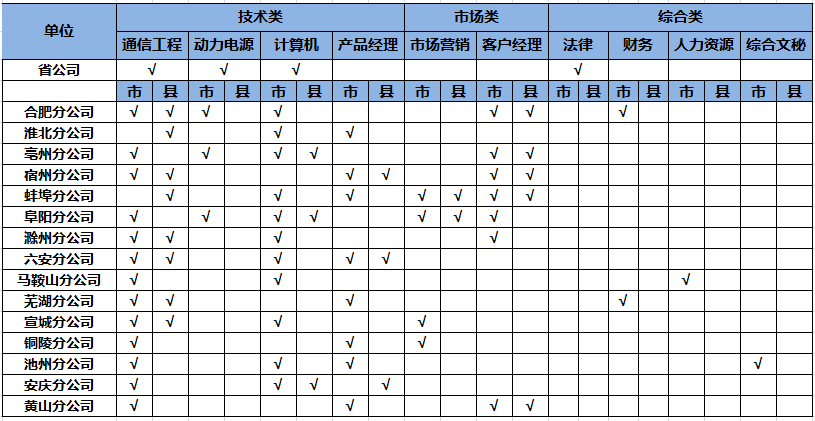 招聘职位:省、市、县公司技术、市场、综合类职位,具体如下: