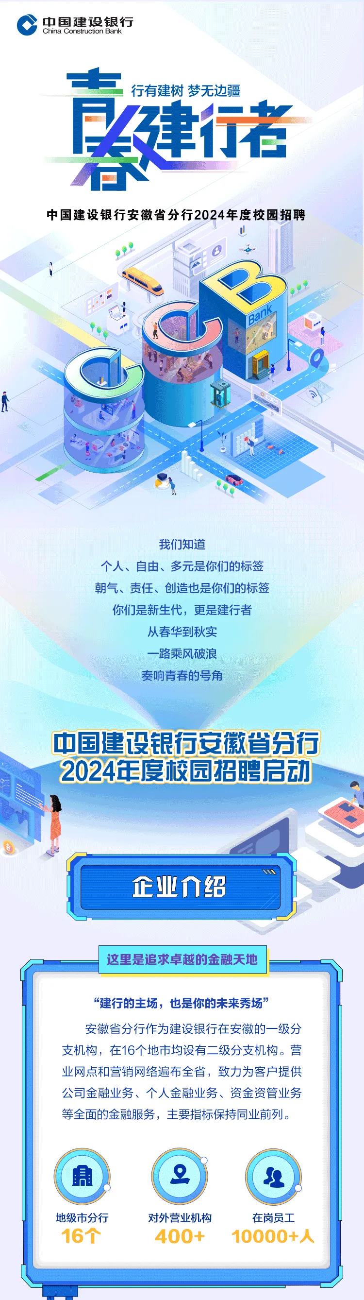 中国建设银行安徽省分行2024年度校园招聘正式启动!