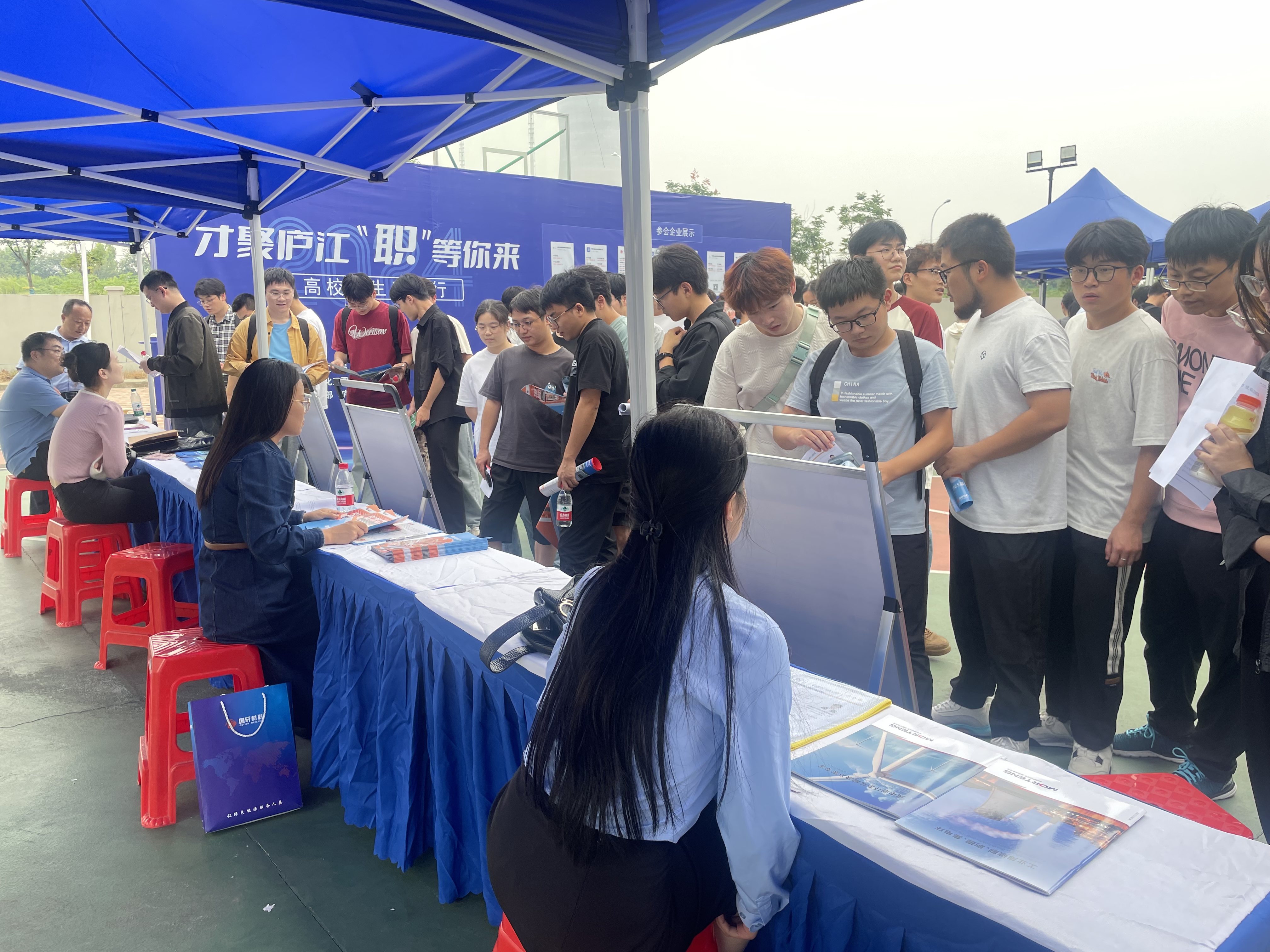 专场对接会结束后,与会师生来到 “才聚庐江 ‘职’等你来”招聘会现场参与招聘。现场合肥国轩电池材料有限公司等17家优质企业带来岗位需求200多个,涵盖材料、化工、机械等多个专业,与参会学生专业匹配度高,毕业生积极与用人单位交流、投递简历,活动现场人头攒动,气氛热烈。