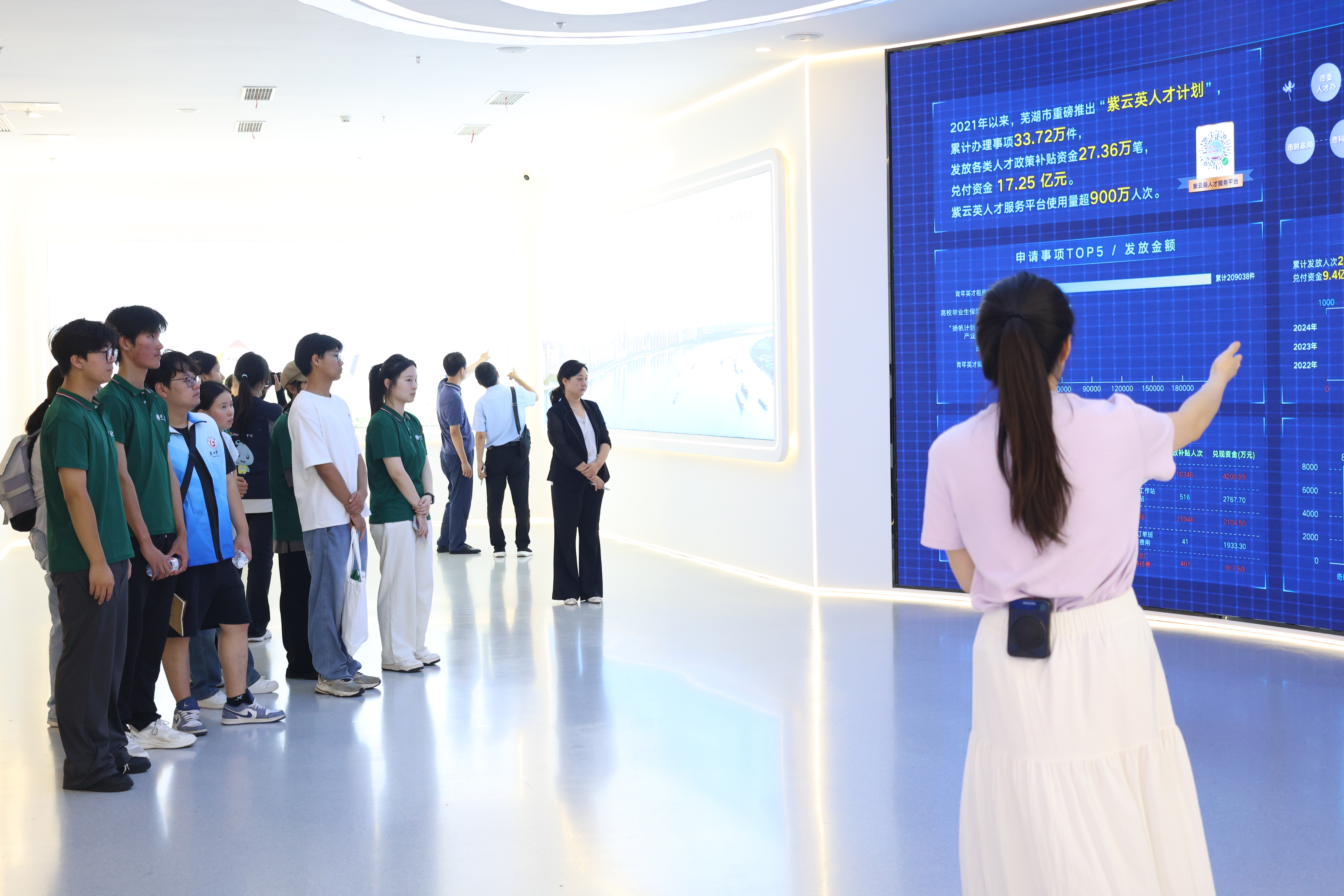 调研团队赴安徽省工业和信息化厅、合肥高新区中安创谷、芜湖产业创新馆等政府、园区解码区域经济“新坐标”。师生共同走进省工信厅光储办,与工作人员近距离交流探讨当前先进光伏和新型储能产业在安徽省的发展情况、未来前景及产业人才需求现状,探索学校学科建设与人才培养思路;在合肥中安创谷展厅,同学们了解到园区建设运营、项目孵化和创新发展等情况,亲身感受空中成像交互等新技术带来的产业升级;芜湖产业创新馆九大产业展厅系统展示了芜湖新能源汽车等新兴产业、支柱产业的最新成就,奇瑞汽车、钻石飞机等现场展品让同学们不禁感叹芜湖高、新、尖的产业创新成果。实践期间,师生累计走访合肥市、芜湖市以及学校周边区域优质企业9家,涵盖新能源汽车、智能制造、节能环保、机器人及智能装备等多个新兴产业,较为清晰地了解了环巢湖区域产业布局情况。