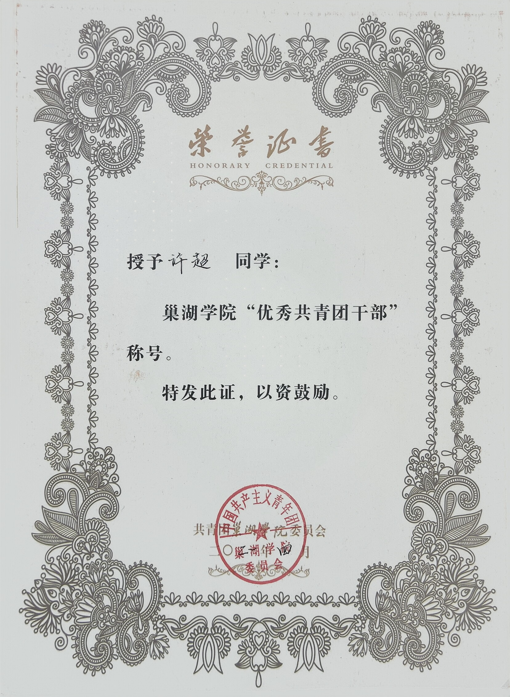 许超,男,汉族,2001年4月出生,中共党员,安徽省合肥市人,必赢626net入口电子工程学院2020级电子科学与技术专业学生,曾任班级班长、实验室主任助理。获校“优秀团干”“优秀学生”“优秀志愿者”等荣誉称号;第十四届全国大学生数学竞赛(CMC)三等奖、校大学生数学竞赛一等奖、大学生职业规划决赛二等奖等奖项;发表了3篇学术论文,多次获得奖学金。在2024年研究生入学考试中,考入安徽大学光电信息工程专业。