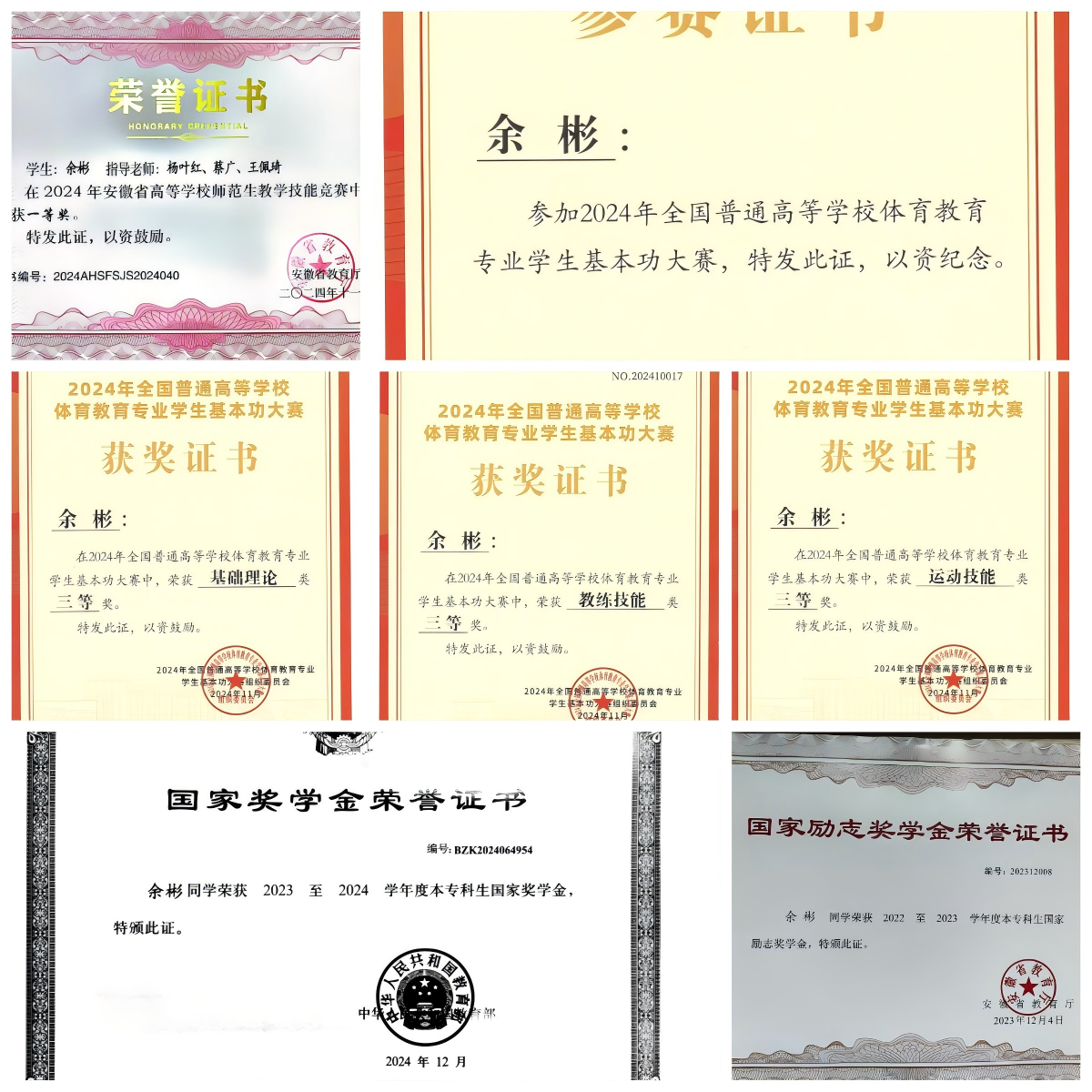 在校期间,他积极参与各项活动与比赛。曾获国家奖学金、国家励志奖学金等国家级奖项5项,县市级奖项10项,校级奖项15项。余彬用扎实的行动培养实践能力,为未来奠定了坚实的基础。作为新时代体育青年,他始终稳扎稳打,不骄不躁,以自强不息的精神,展现了新时代青年的风采与担当。