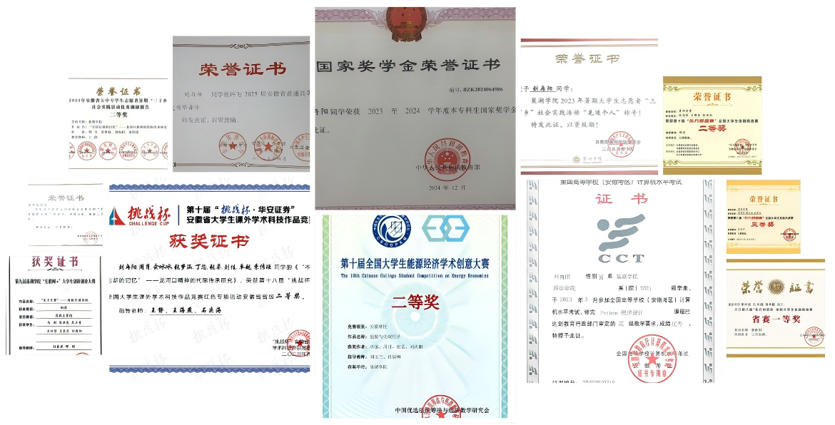 本着高度的责任感和不服输的精神,刘冉阳在队伍中做到凡事亲力亲为,遇到小问题就沟通协调,遇到结构性问题就调整策略,针对矛点拆分开来做到对症下药。他的这份信念与担当也造就了他如今令人瞩目的卓越成就。在校期间,刘冉阳勤奋进取,成绩卓越,荣获国家奖学金,第八届东方财富杯国家级三等奖、省级一等奖、安徽省国贸技能大赛一等奖等奖项共20余项,同时,他还主持1项国家级大创项目获得优秀结项并发表3篇学术期刊,在暑期大学生志愿者“三下乡”社会实践中荣获二等奖与先进个人称号。这些荣誉,是他的经验积累,更是他信念淬炼的结晶。