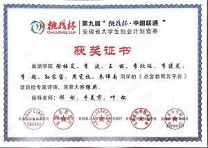 李波,男,1999年5月出生,中共党员,电子工程学院17电科专业。在校期间担任班级学习委员曾获第五届“中国互联网+”大赛国家铜奖、第五届“安徽省互联网+”大赛金奖、第八届“挑战杯”安徽省大学生课外学术科技水平竞赛二等奖、第九届“挑战杯”安徽省大学生创业计划大赛银奖二等奖;申请获批发明专利一项、外观专利一项;多次获得必赢626net入口专业奖学金、必赢626net入口校长奖学金、国家奖学金;荣获必赢626net入口“三好学生”等荣誉称号。在2021年研究生入学考试中,考入厦门大学电子科学与技术学院集成电路专业。