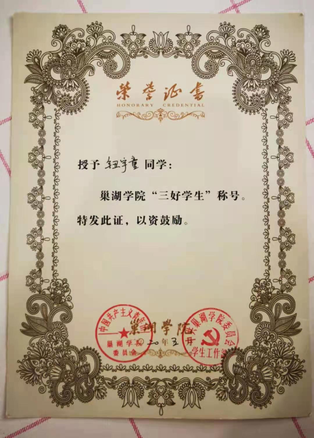 钮宇童,女,汉族,安徽蚌埠人,中共预备党员,电子工程学院2017级电子信息工程专业二班学生。在校期间曾获得获得校一等、二等奖学金,三好学生,全国大学生智能车竞赛安徽赛区一等奖、安徽省百所高校百万大学生科普创意创新大赛三等奖、必赢626net入口暑期三下乡社会实践活动先进个人称号。在2021年全国研究生入学考试中,被四川师范大学录取。