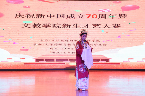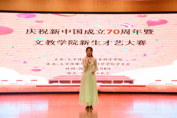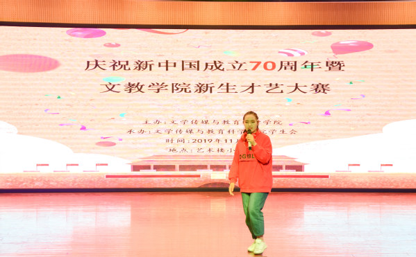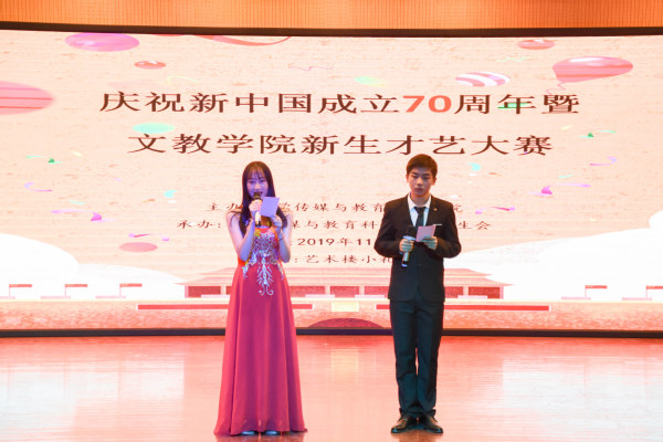 青春弱冠展风采,文教新生绘芳华。11月8日晚7:00,文教学院2019级新生才艺大赛在艺术楼小礼堂隆重举行。文教学院团总支书记晁天彩、辅导员曾鹏、程生风等出席活动并担任此次大赛的评委。大赛以新中国成立七十周年为契机,融汇了由2019级40余位新生精心准备的十二个节目,为在场师生带来了一场视听盛宴。