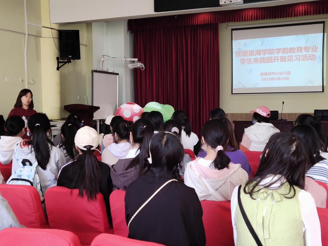 3月24日下午,文教学院2020级学前教育专业全体学生,由专业教师张平带队,赴巢湖市中心幼儿园教育集团,开展2021学年春季教育见习活动。此次教育见习活动,计划持续九周时间,要求学生每周三或周五下午,全程观摩参与幼儿园各年级的教育教学活动,并完成相关的见习任务。