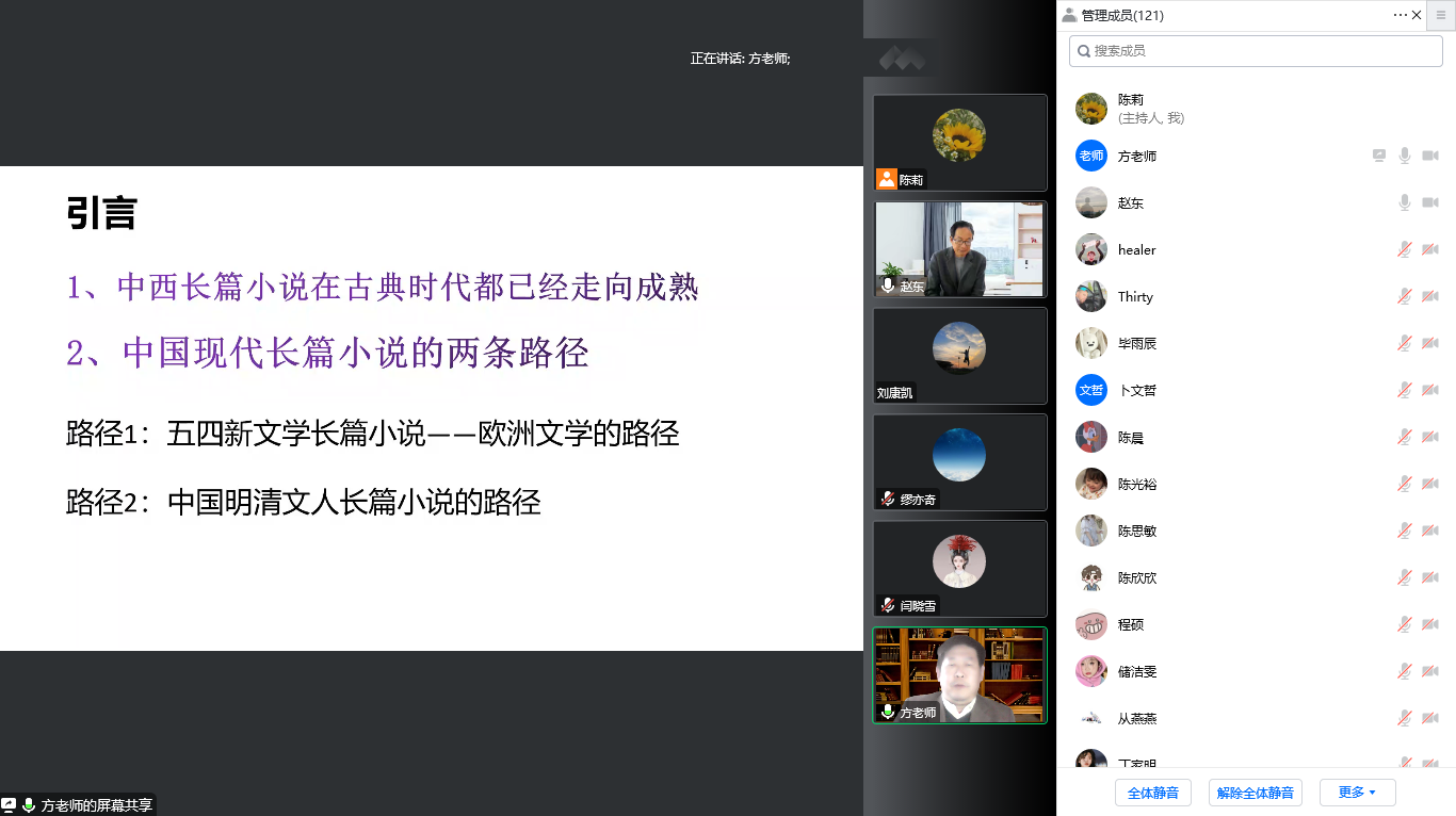 方维保教授在讲座里提出,中国现代长篇小说文体有两条发展路径,一是五四新文学长篇小说欧洲文学路径,二是中国明清文人长篇小说的发展路径方维保教授以大量的小说文本阐释为例,完整梳理了中国现代长篇小说及其文体发展史,具体包括:五四时代的现代长篇小说文体探索、1930年代长篇小说文体成熟新文体期待1940年代长篇小说文体的新变。