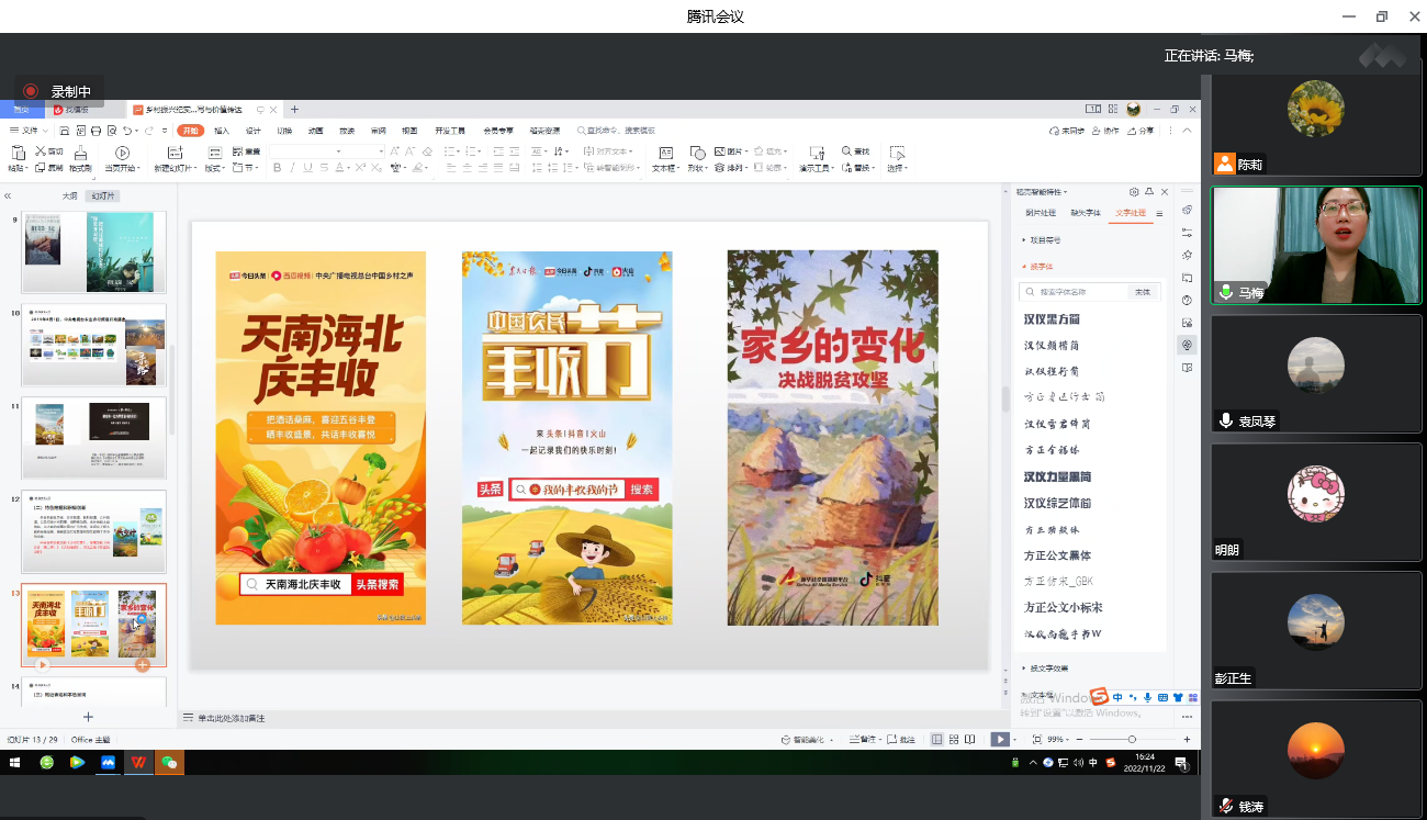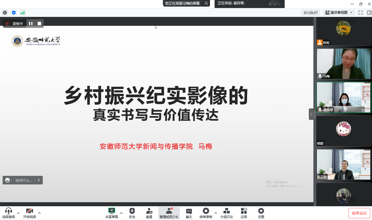 11月22日下午,文学与传媒学院学术活动月系列活动之“汤山传媒讲坛”首场活动精彩开讲。安徽师范大学新闻与传播学院副院长、教授、博士生导师马梅应邀作题为“乡村振兴纪实影像的真实书写与价值传达”的学术讲座。讲座由文学与传媒学院院长彭正生教授主持,学院师生通过线上线下方式积极参与。