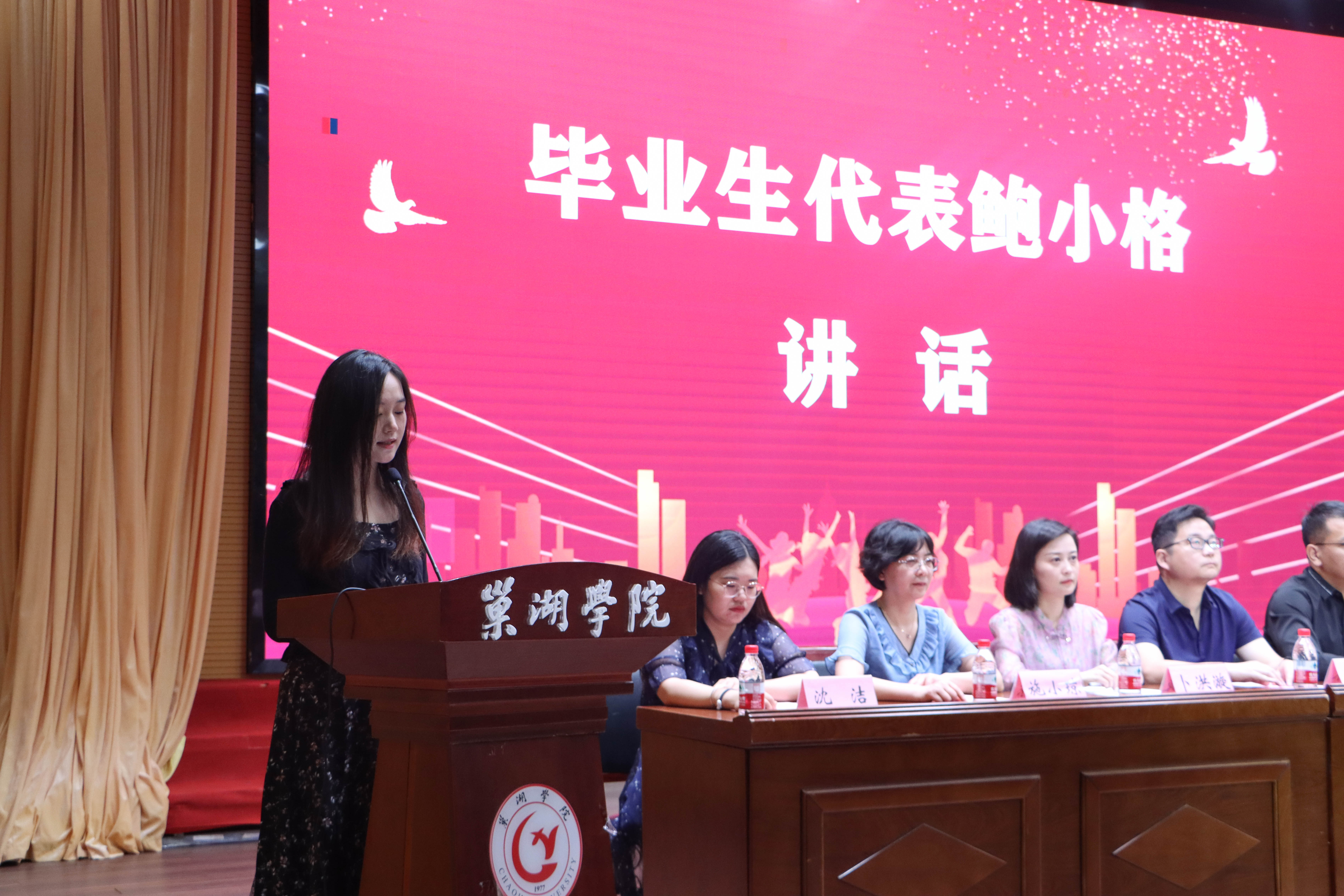 毕业生代表鲍小格讲话中回忆了四年快乐时光,她说“感谢母校培养了我坚守初心的执著和心怀家园的担当,感恩母校给予我一个登高望远的阶梯,感恩老师给与的知识和关怀。她代表毕业生表示,将不忘母校教诲,勇担时代的重任,以青春之名,赴时代之约。”