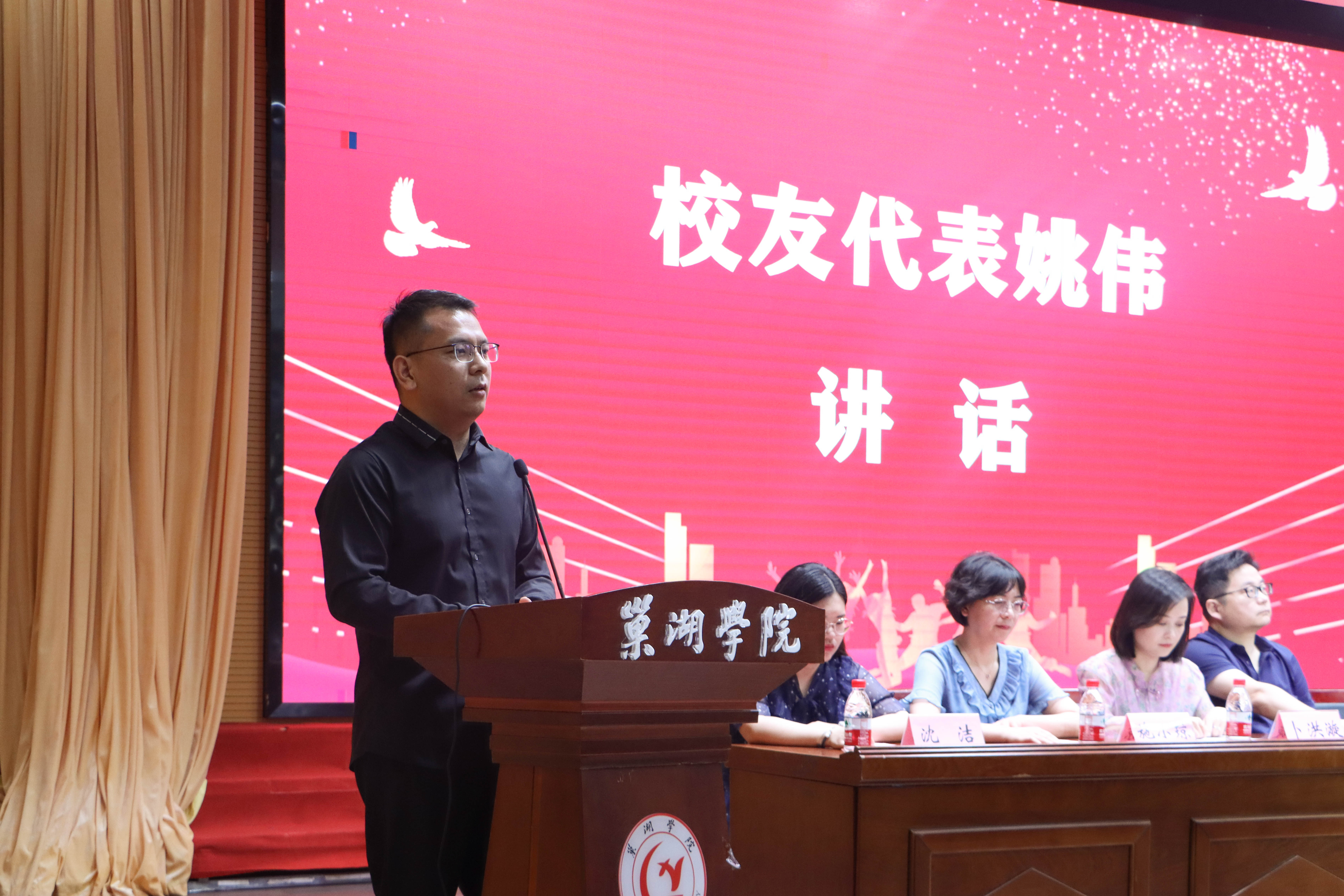 校友代表、2011届广告学毕业生、现任蓝动科技(安徽省)集团有限公司董事长姚伟分享了自己毕业后求职与创业的经历,用自己的切身经历鼓励即将走上工作岗位的学弟学妹们,要坚持追逐梦想的脚步和积极向上的生活态度;要勇敢面对、积极战胜成长道路上遇到的各种困难。