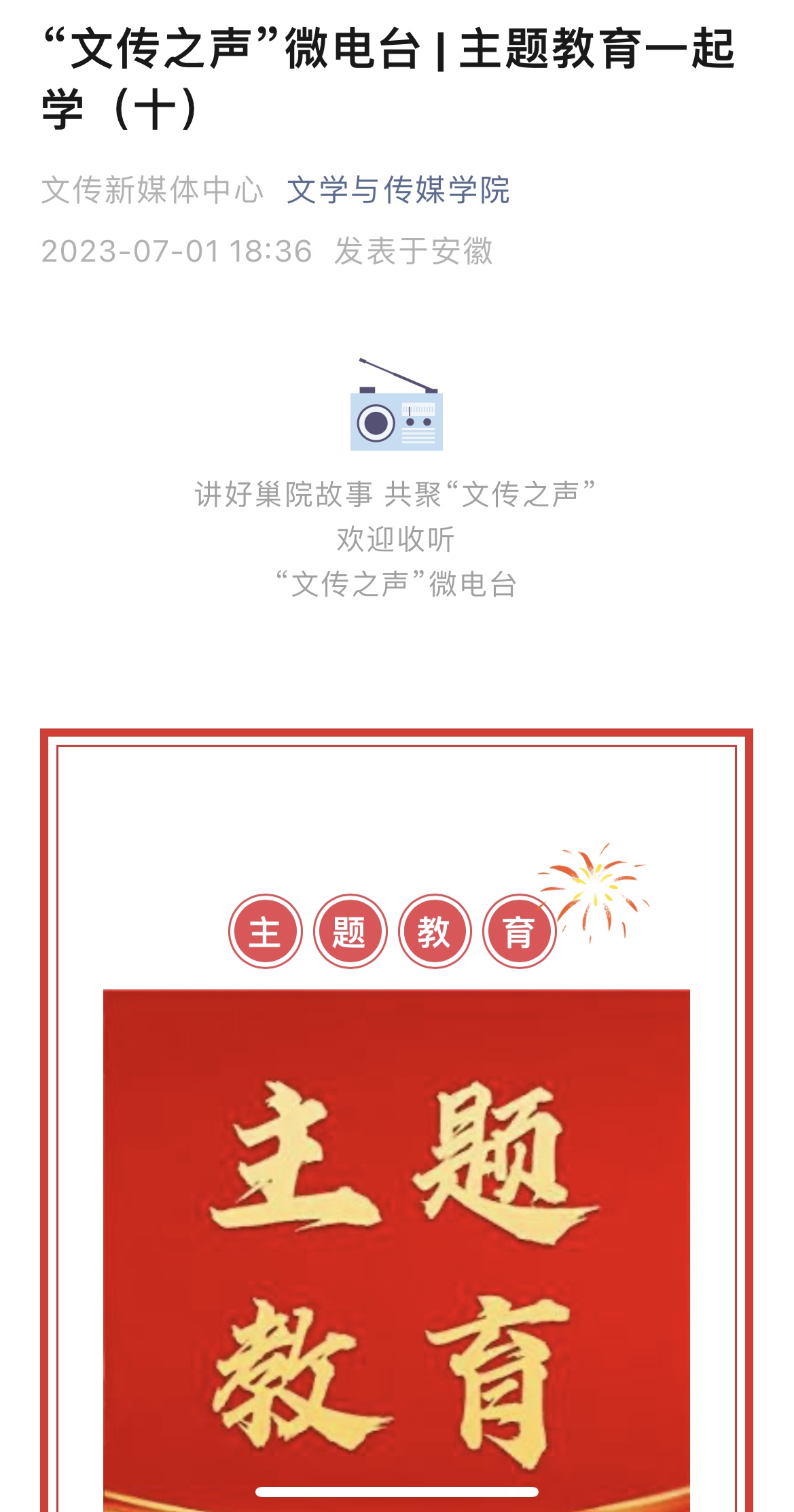 发挥专业优势,营造氛围助力学。为强化思想引领,“文传之声”微电台《主题教育一起学》专栏,特别推送教师党员系列播报,运用专业优势把学习贯彻习近平新时代中国特色社会主义思想不断引向深入。