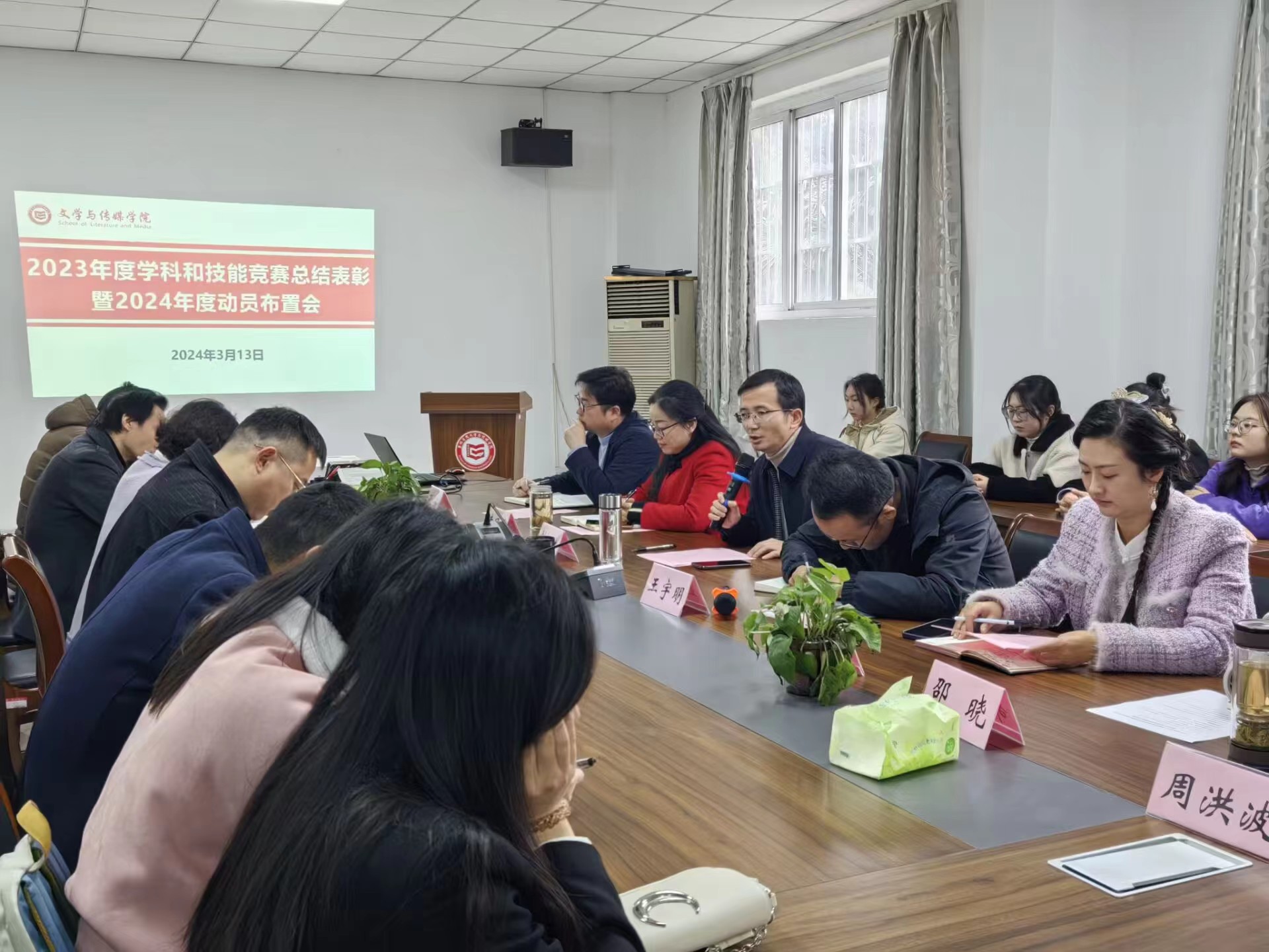 为总结2023年度学科和技能竞赛经验,部署2024年学科和技能竞赛工作,3月13日下午文学与传媒学院在敏行楼会议室召开了2023年学科和技能竞赛表彰暨2024年动员会。院领导班子、各基层教学组织负责人、各专项赛事负责人、各年级赛长及获奖同学代表参加了此次会议,会议由副院长王宇明主持。