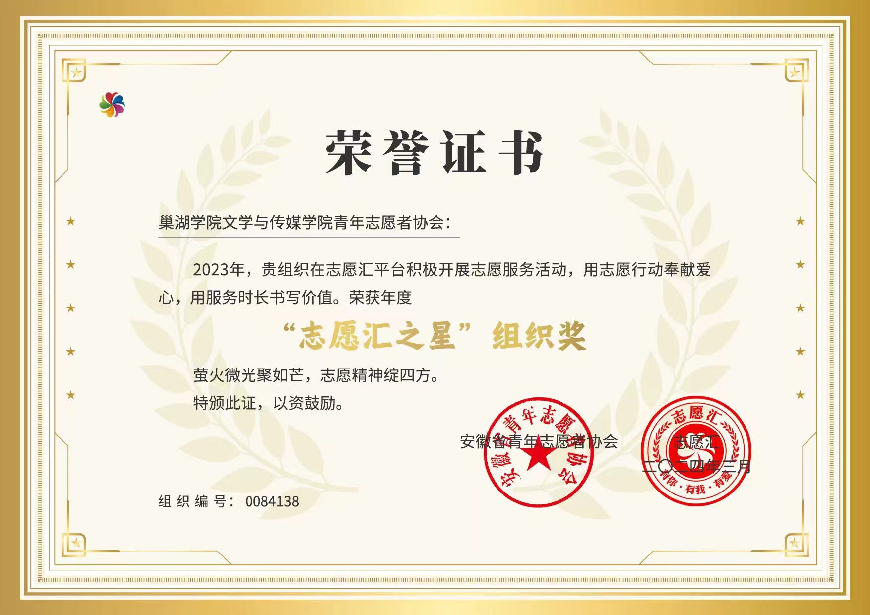 近日,文学与传媒学院青年志愿者协会获评安徽省2023年度“志愿汇之星”组织奖。该奖项由安徽省青年志愿者协会根据年度志愿服务活动次数、服务时长、工作组织力度等方面进行评选,全省共评选100个组织。这是继2023年学院获评必赢626net入口优秀青年志愿者协会后取得的又一项集体荣誉。