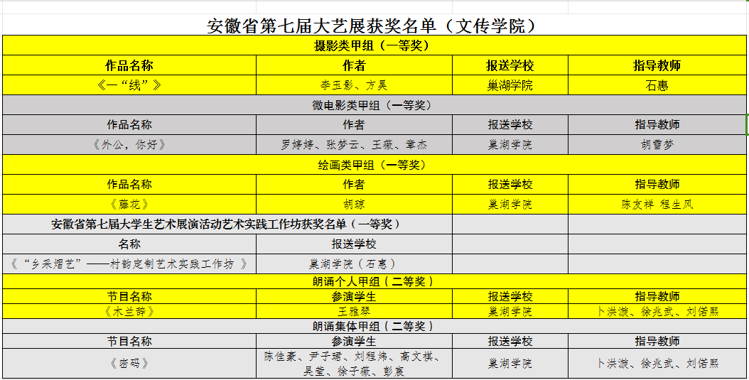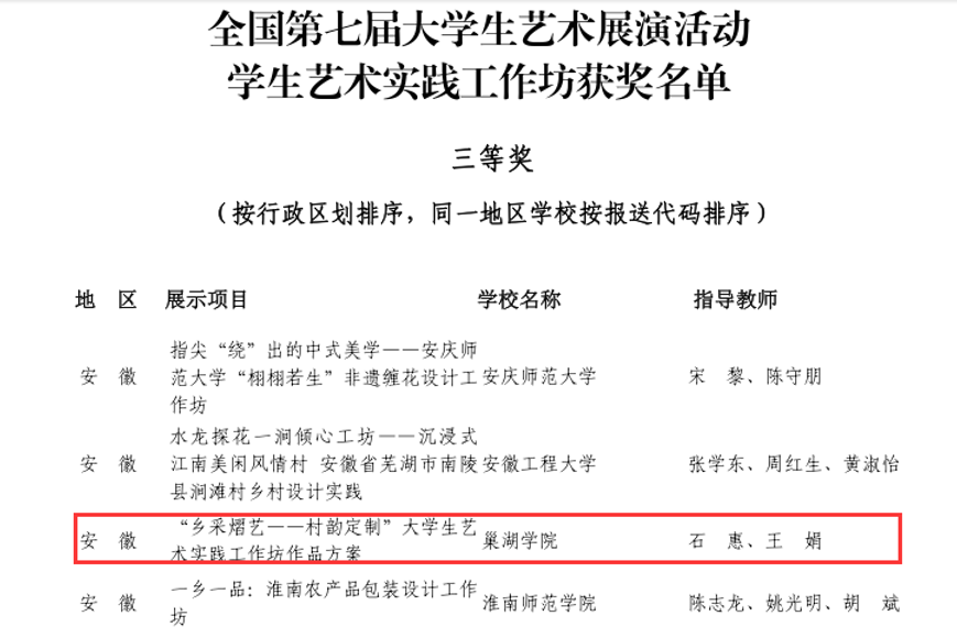 石惠、王娟老师的《乡采熠熠——村韵定制艺术实践工作坊》获艺术实践工作坊国家级三等奖、安徽省一等奖,李玉影、方昊的作品《一“线”》获摄影甲组类安徽省一等奖,罗婷婷等的作品《外公,你好》获微电影类甲组安徽省一等奖,胡琼的作品《藤花》获绘画类甲组安徽省一等奖,王雅琴等的作品《木兰辞》、陈佳豪等的作品《密码》获朗诵个人甲组安徽省二等奖。(文、图/程生风 初审/孙冰 终审/袁凤琴)