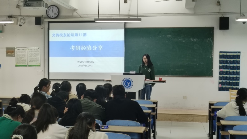 109日下午,文学与传媒学院在慎思楼北103教室举办了文传校友论坛(第11期)。本期论坛邀请2023届优秀校友,安徽农业大学中国语言文学专业在读研究生汤云帆,和同学们分享她的考研经验。论坛由学院党委副书记孙冰主持,2022级汉语言文学专业同学参加了此次活动。