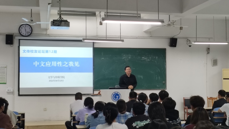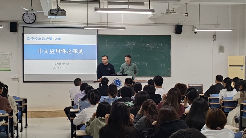10月13日上午,值2024年校友返校日暨首届秩年校友返校活动之际,文学与传媒学院在慎思楼北102教室举办了第12期文传校友论坛,邀请8位中文系校友,让他们与2024级汉语言文学专业同学面对面交流,畅谈对中文应用性的理解。论坛由学院党委书记袁凤琴主持。