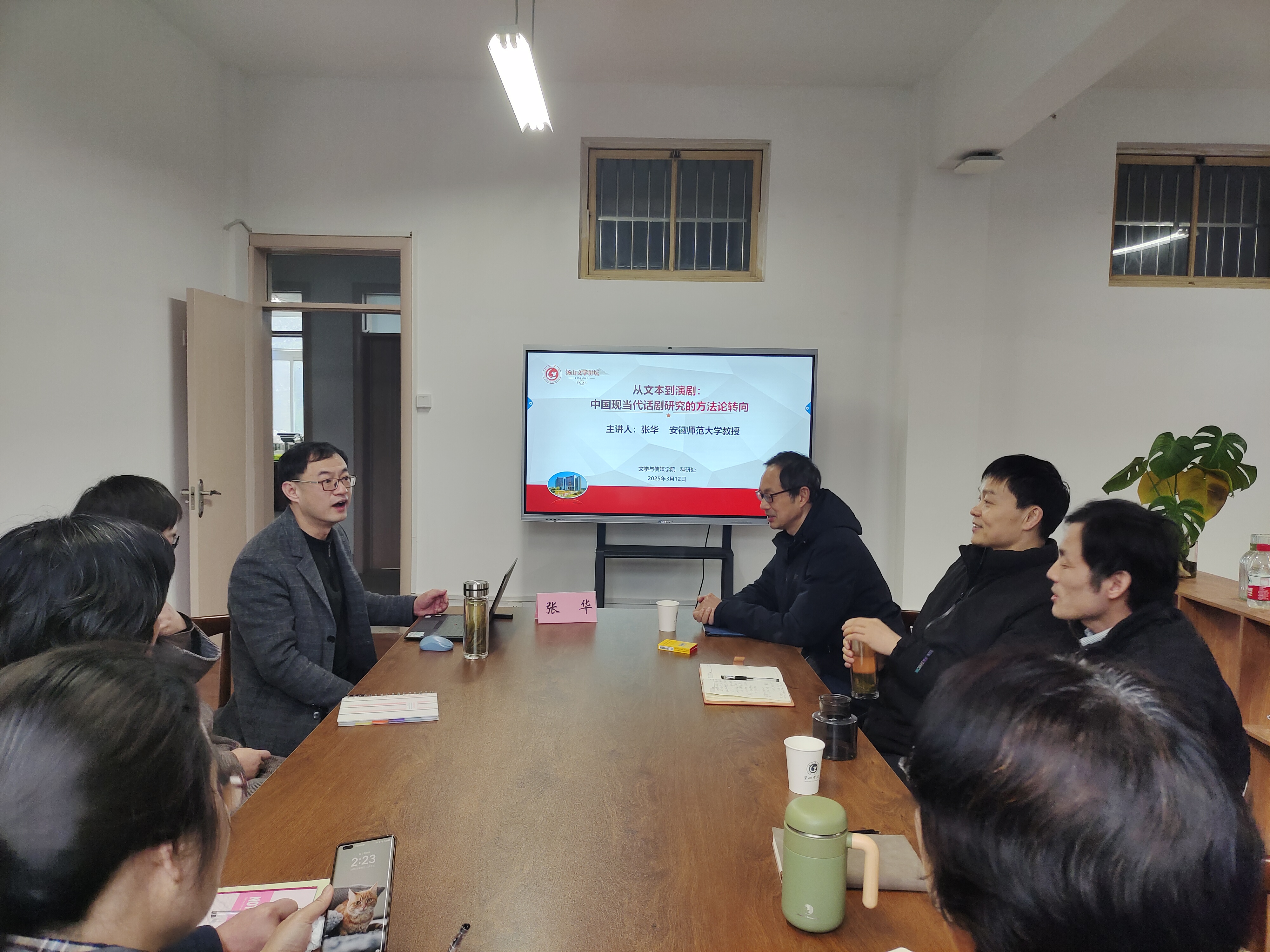 3月12日下午,文学与传媒学院第17期“汤山文学讲坛”在敏行楼阅览室举行,安徽师范大学文学院教授张华应邀作题为“从文本到演剧:现当代话剧研究的方法论转向”的学术讲座。讲座由赵东教授主持,中文系部分教师参加。