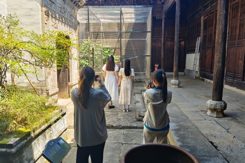 对接会后,团队成员开展实地探访。镜头先后对准侯村祠堂的飞檐斗拱、张大千父母墓的静谧氛围与宝塔寺的古朴风貌,用特写镜头记录石雕、碑文等文化符号;在蓝缘民宿,团队捕捉到庭院景观与民宿独特的教室风格,为后续民宿品牌宣传积累素材。