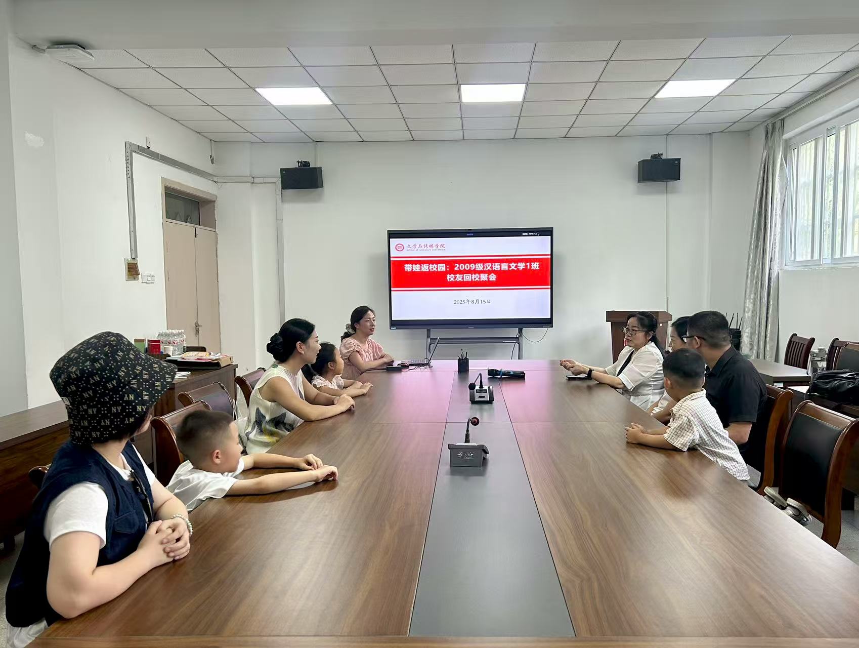 8月15日,暑风蝉鸣,文学与传媒学院迎来了一批特殊的 “访客”——2009级汉语言文学1班的“亲子返校团”。校友们携子女重游校园,赴一场跨越十二年的“青春之约”。学院党委书记袁凤琴、校友联络员李陈热情接待校友一行。