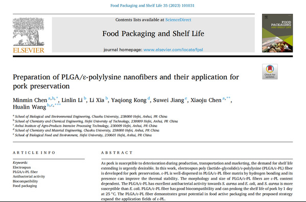 中心研究人员陈敏敏博士长期从事食品复合膜活性包装以及功能性纳米材料的研究。最近,在食品包装材料研究中取得新进展,相关成果以“Preparation of PLGA/ε-polylysinenanofibersand their application for pork preservation”为题发表在国际权威期刊《Food Packaging and Shelf Life》(中科院一区,IF:8.749)。