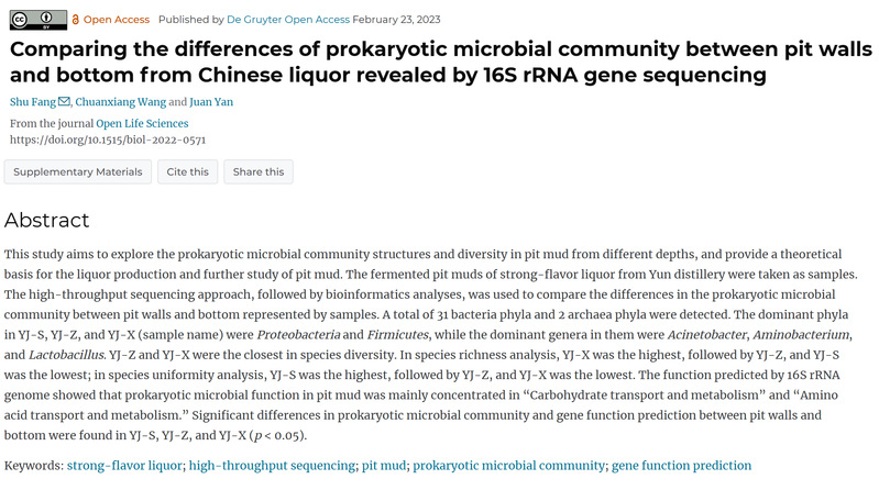 为了探索不同深度窖泥中原核微生物群落结构和多样性,为浓香型白酒生产和窖泥的进一步研究提供理论依据。方舒老师以安徽运酒厂浓香型白酒发酵后的窖泥为样品。通过高通量测序方法,然后进行生物信息学分析,最后分析比较样品所代表的窖池壁和窖池底部之间原核微生物群落结构的差异。详细研究内容请见论文全文链接https://doi.org/10.1515/biol-2022-0571