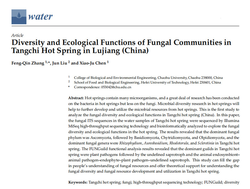 近日,中心研究人员张凤琴长期从事微生物发酵的研究。目前在温泉微生物的研究中取得新进展,相关成果以“Diversity and Ecological Functions of Fungal Communities in Tangchi Hot Spring in Lujiang (China)”为题发表在国际权威期刊《Water》(中科院三区,IF:3.3)。