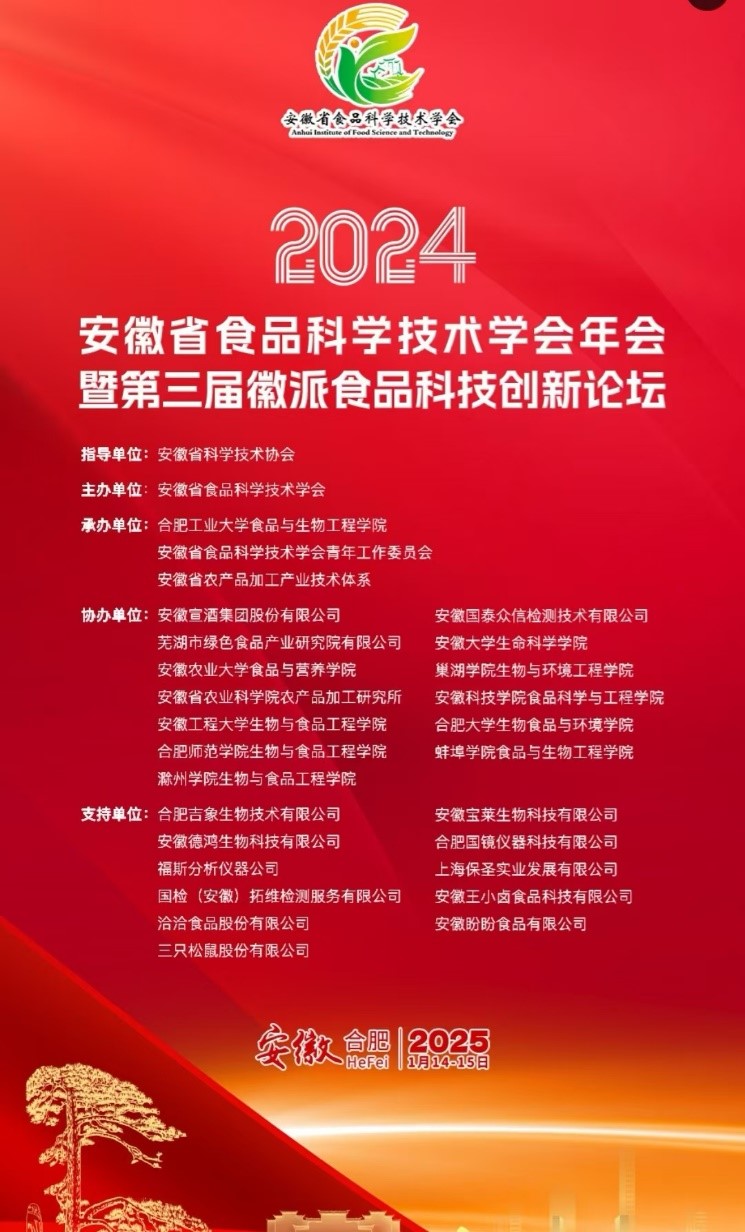 2024年安徽省食品科学技术学会年会暨第三届徽派食品科技创新论坛于2025年1月14日至15日在合肥召开。此次会议由合肥工业大学食品与生物工程学院、安徽省食品科学技术学会青年工作委员会、安徽省农产品加工产业技术体系联合承办,必赢626net入口生物与环境工程学院是协办单位之一。