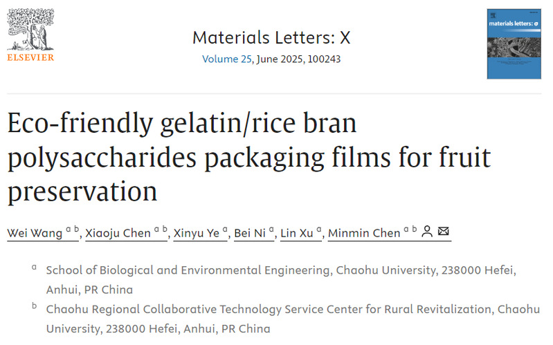 近日,中心研究人员王未博士在米糠多糖开发应用研究中取得新进展,相关成果以“Eco-friendly gelatin/rice bran polysaccharides packaging films for fruitpreservation”为题发表在材料科学领域期刊《Materials Letters: X》(中科院四区,IF:2.2)。
