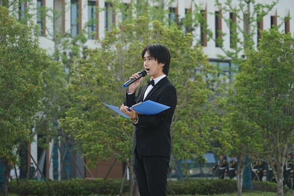 国旗护卫队迈着整齐划一的齐步,踢着铿锵有力的正步,护卫五星红旗向升旗台走去,在嘹亮的国歌声和庄重的注目礼中,鲜艳的五星红旗冉冉升起。国旗下,经法学院2022级金融工程专业斯涵同学、工商学院2020级财务管理专业王艳同学代表青年学生,分别以“心有所信,行稳致远”“微光成炬,薪火相传”为主题作动人心弦的演讲。斯涵分享了学习贯彻全国“两会”精神的感悟,号召广大青年学生要珍惜当下,怀抱梦想,保持永不懈怠、艰苦奋斗的前进姿态,沉下心来苦干实干,为将来长久的学习、职业生涯打下坚实基础。王艳通过观看中央广播电视总台《榜样7》节目,被勇敢的共产党员在困难面前表现出的不屈不抗精神和无私奉献品质所感动,寄语青年要把对“榜样”的崇高敬意转化为干事创业的不竭动力,努力在新征程中昂首奋进,书写新的华章。两位同学的动人演讲,展示了新时代青年坚定的理想信念和远大的目标追求。
