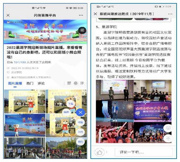 学校建设“大学生网络文化工作室”11个,产出“环巢湖红色教育基地手绘地图”“我与国旗同框”“英雄烈士纪念汇”“校园好声音”“掌上校运会”等新媒体产品。其中,“巢院易班吉祥物”表情包成功申报专利及版权保护,在微信商城上线并下载使用5万余次。