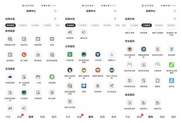2018年,学校在全国率先开展易班与今日校园共建试点建设工作,将易班app与今日校园app进行整合,建成官方“易班·今日校园”移动校园平台。学校以学生需求为导向,将学生事务线上一站式服务大厅嵌入易班·今日校园平台(PC端整合学生常用应用82个,移动端61个),及时上线“课表成绩查询”“宿舍报修”“奖助学金申请”“第二课堂”“失物招领”等应用,实现入学报到、信息查询、请销假、活动报名、查寝、通知、奖助学金申请、宿舍报修等日常事务线上操作,基本覆盖学生校内生活全场景,累计访问量700万+次,日均活跃度2万次以上,已成为学生用得上、离不开、喜欢用的生活学习平台。学校的共建做法在全国广泛推广,全国160余所高校(安徽省40余所)复制我校易班与今日校园共建互融做法。