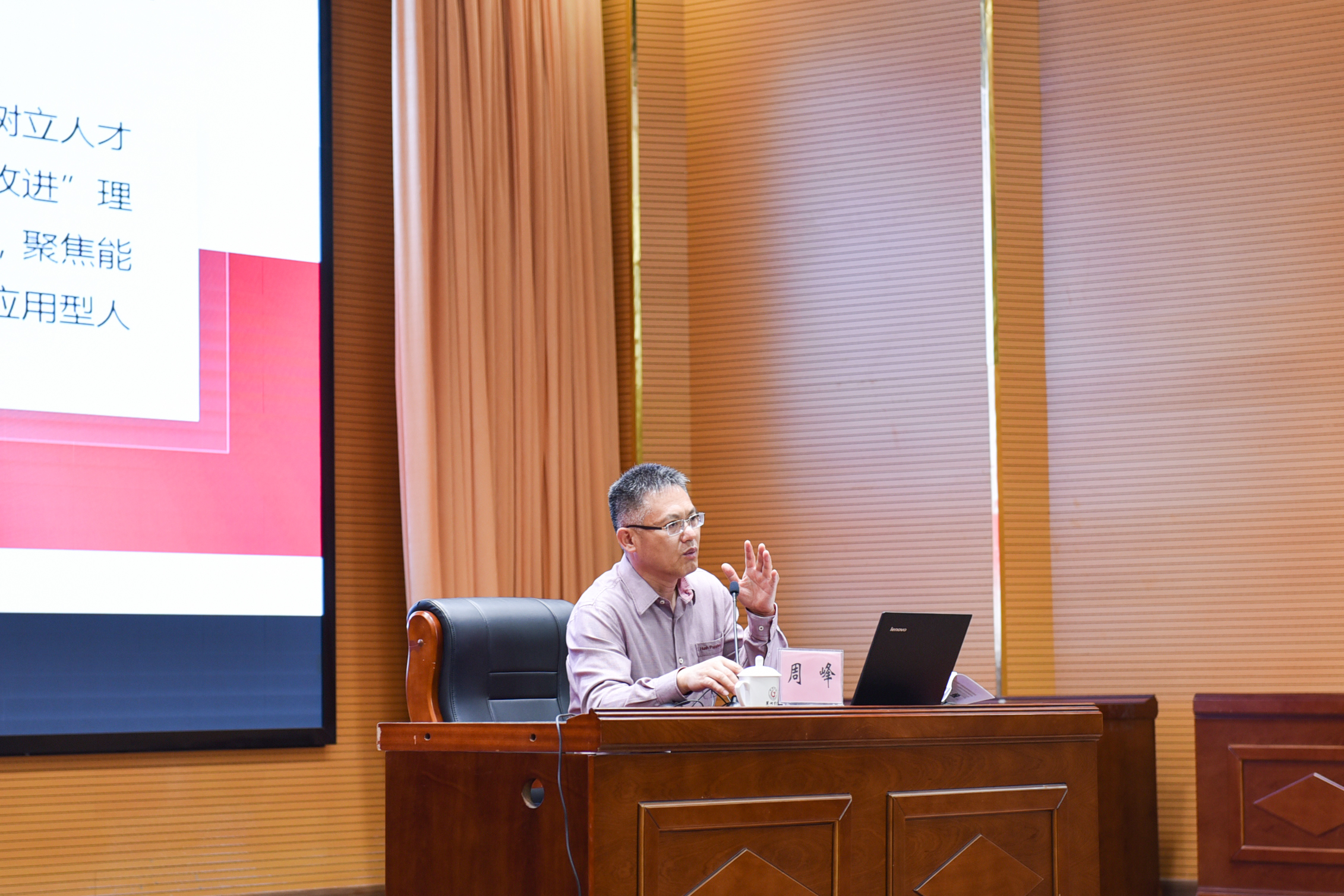 周峰结合个人学习体会和学校发展实际,就学习贯彻好习近平新时代中国特色社会主义思想从深刻把握习近平新时代中国特色社会主义思想的理论体系和世界观方法论、深刻把握习近平总书记关于教育的重要论述、以主题教育凝心铸魂推动学校事业高质量发展三个方面作深入讲授。