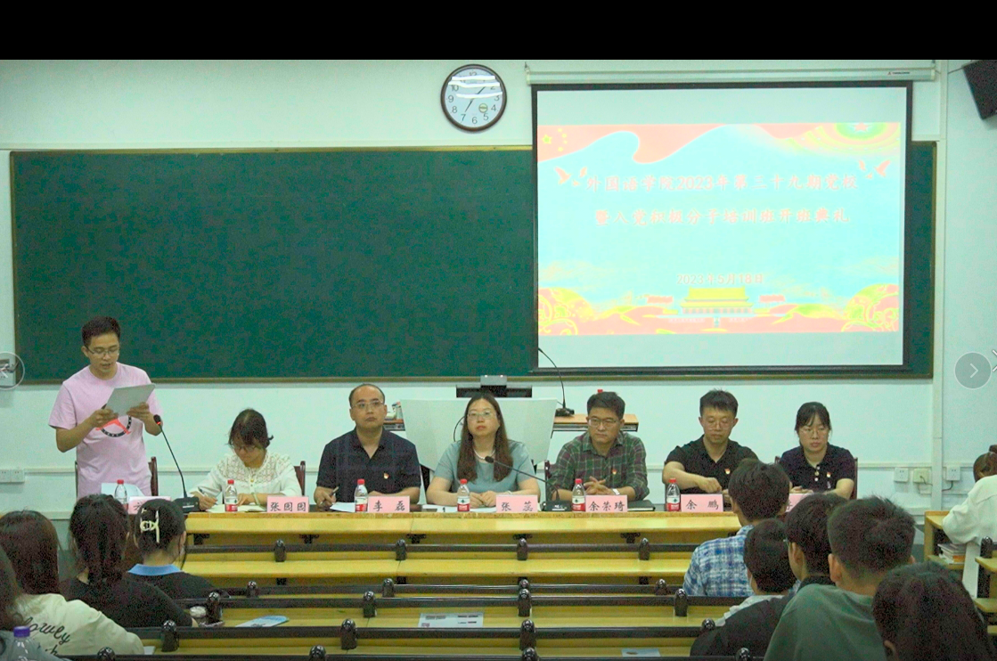 为深入学习贯彻习近平新时代中国特色社会主义思想,5月18日晚,外国语学院于明德楼西二教室举行第三十九期分党校开班典礼。院党委书记张蕊、院长余荣琦、院党委副书记李磊、副院长余鹏、学生第一、第二支部书记李玲、张园园出席典礼,典礼由班主任方磊主持,全体学员参会。