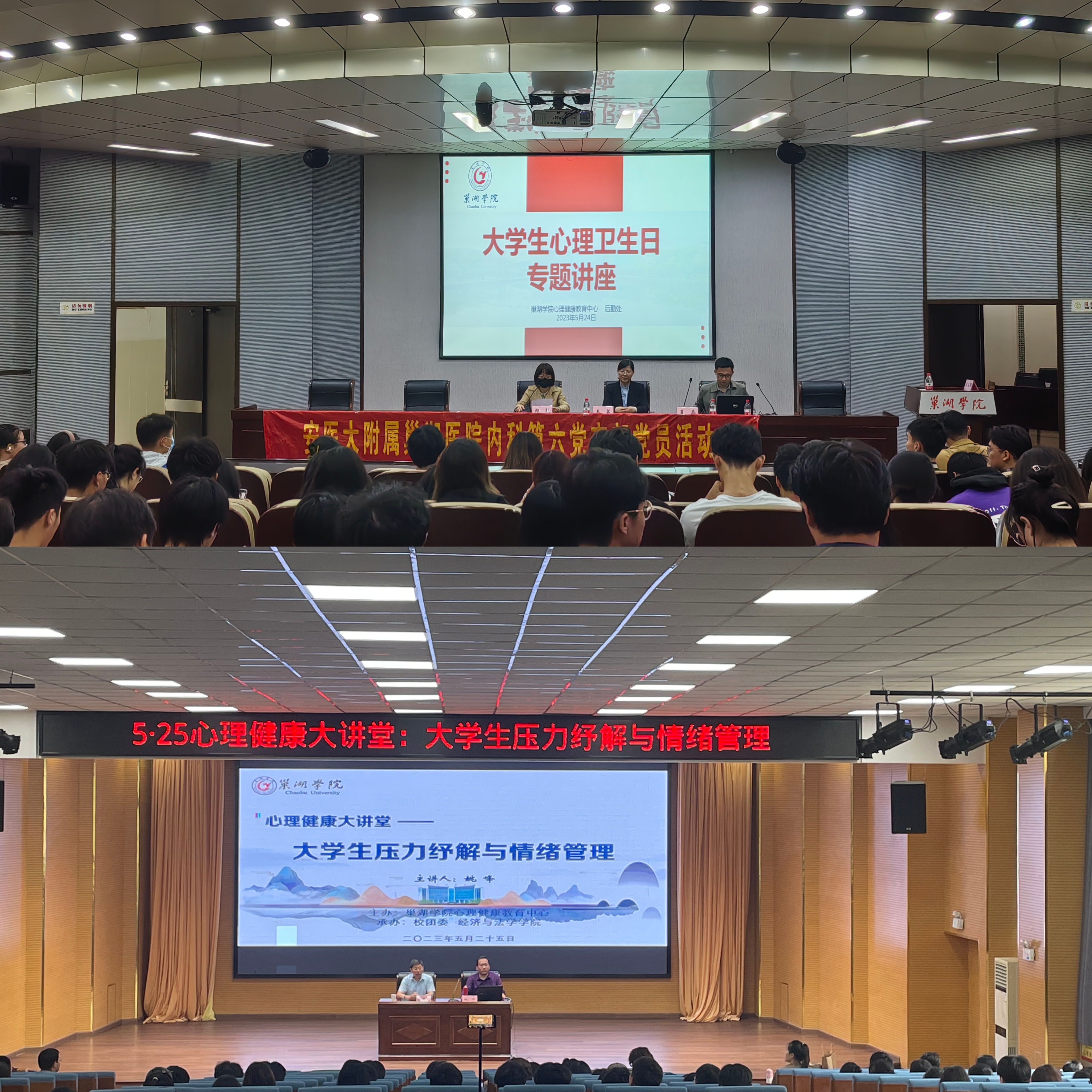 为深入贯彻落实党的二十大精神,贯彻落实党中央、国务院和省委、省政府及省委教育工委省教育厅关于大学生心理健康工作决策部署和工作要求,落实教育部等十七部门联合印发的《全面加强和改进新时代学生心理健康工作专项行动计划(2023—2025年)》,扎实推进学校心理健康教育工作,5月24-25日,必赢626net入口特邀安徽医科大学附属巢湖医院儿童青少年心理门诊负责人夏磊博士、安徽警官职业学院警察系副主任姚峰教授分别作《青少年常见精神障碍及心理治疗》、《大学生压力纾解与情绪管理》心理健康教育专题讲座。现场向同学们传授心理健康专业知识,培育学生自尊自信、理性平和、积极向上的健康心态,营造“助人、自助、互助”的良好氛围。